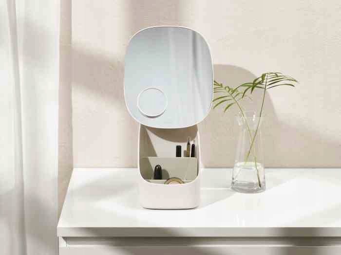 - органайзер для косметики с двумя зеркалами; целое состоит из большого и маленького зеркала и контейнера для косметики