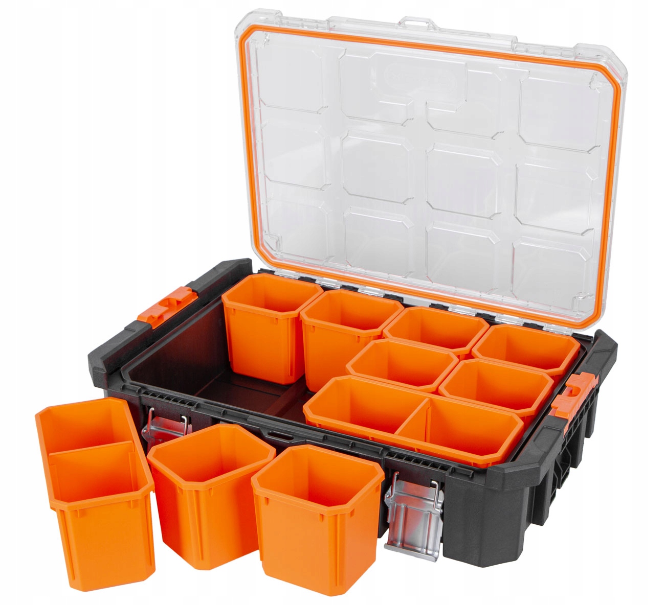 - Прочные алюминиевые защелки для безопасного закрытия органайзера.
