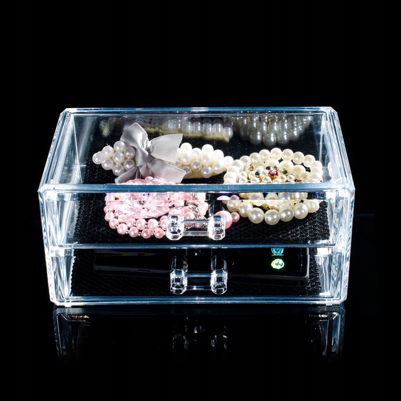 Практичный органайзер из более толстого прозрачного акрила для косметики, аксессуаров и украшений различных размеров. Имеет 2 выдвижных ящика, благодаря которым можно легко и практично организовать косметику или украшения.