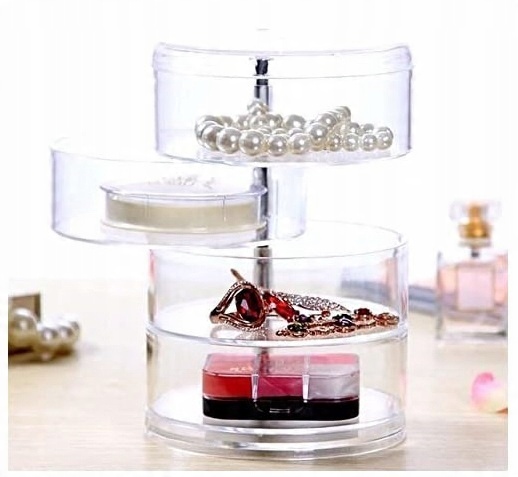 Практичный органайзер для косметики или украшений из более толстого пластика. Это позволяет легко и практично организовать эти аксессуары. Органайзер имеет 4 уровня, каждый из которых вращается на 360 градусов.