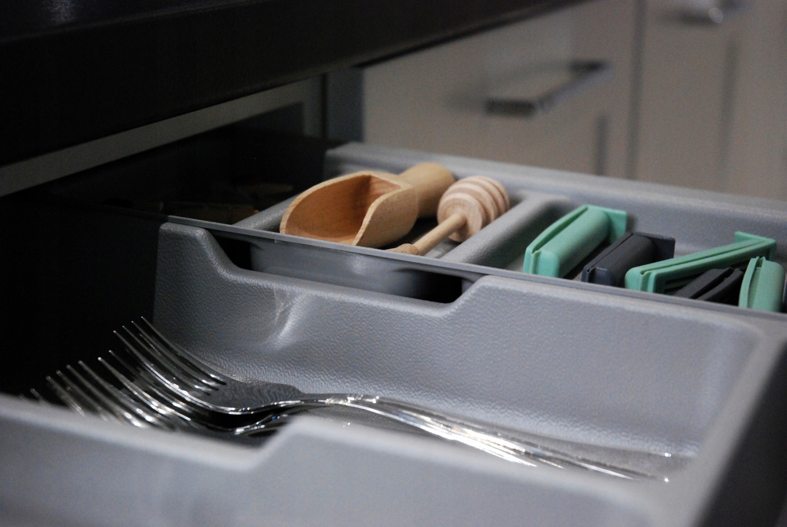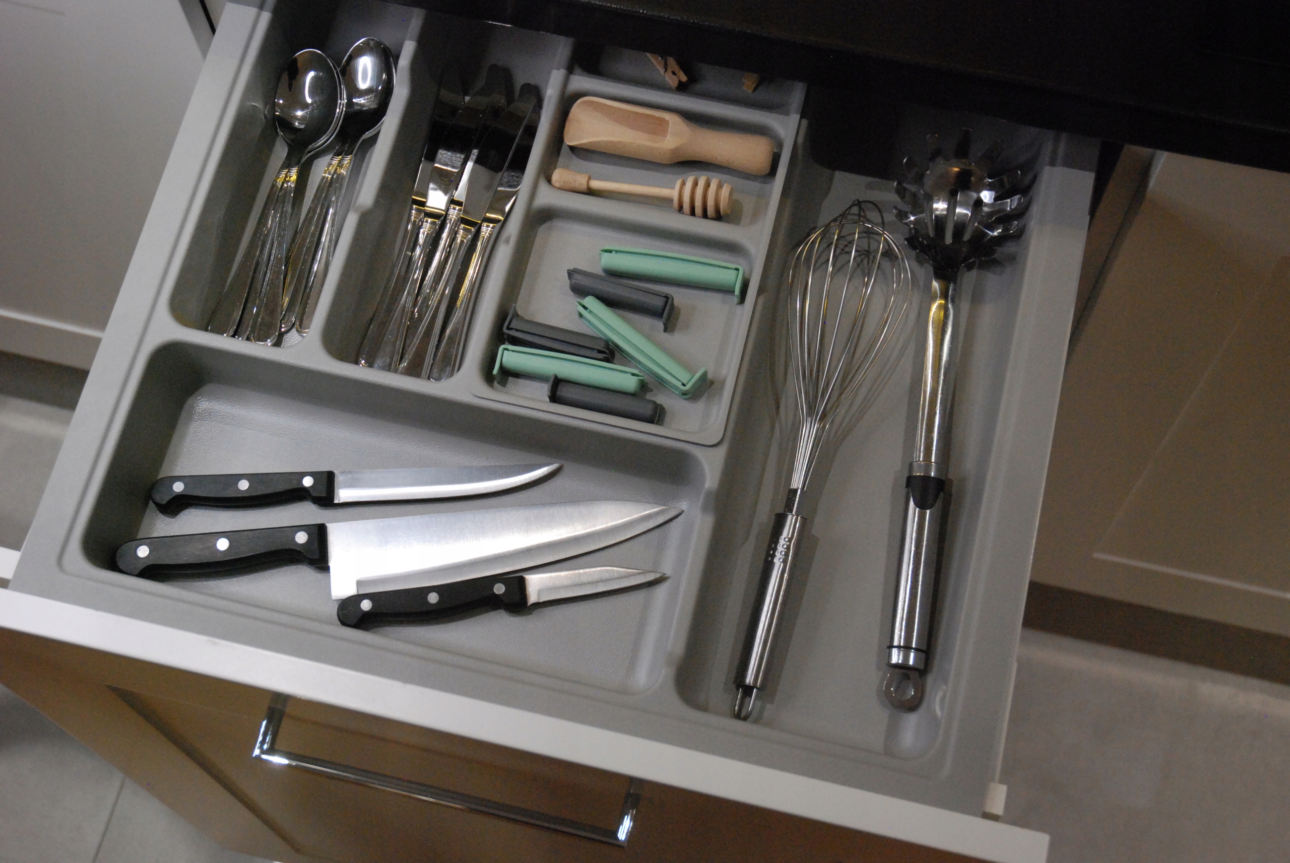 Благодаря длинным и широким камерам во вставке можно разместить не только стандартные столовые приборы, но и другую домашнюю утварь. Дополнительный передвижной чехол, который можно разместить в трех разных местах вставки, обеспечивает дополнительное место для хранения мелких аксессуаров.