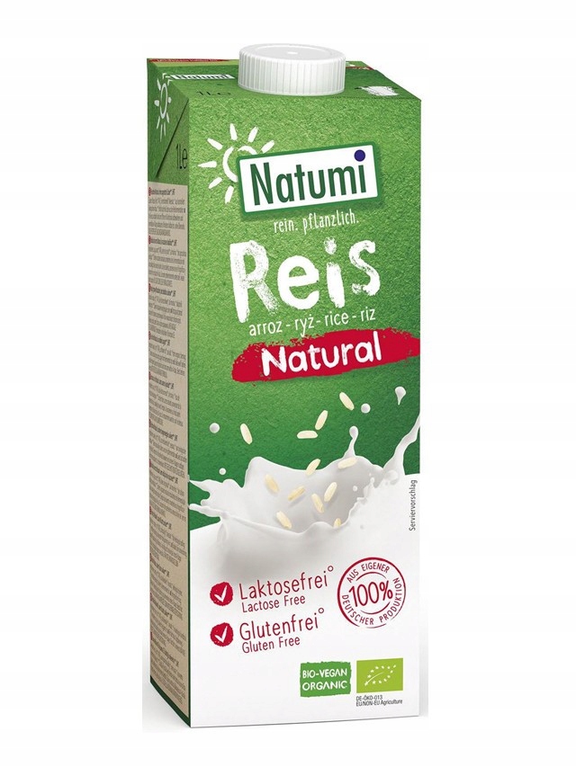 ВеганскийРисовый напиток Natumi на 100% растительной основе, без глютена, лактозы бесплатно b>, без добавления сахара. Содержит натуральные сахара, полученные в результате ферментации риса.