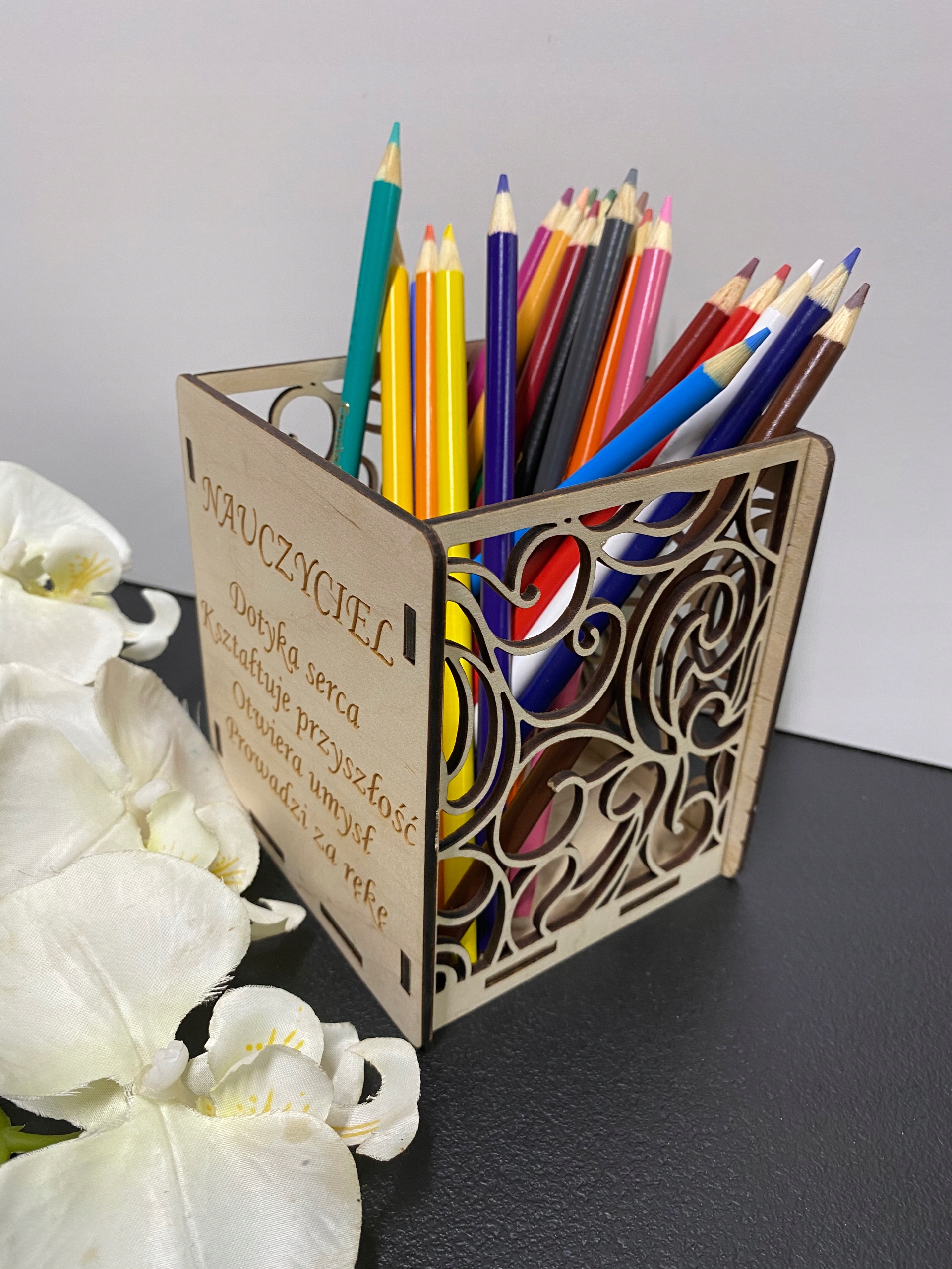 Contonter -организатор для карандаша изготовлен из 3 -миллиметровой беремской фанеры. Передний организатор имеет гравированный текст, а остальные 3 страницы - это открытые.