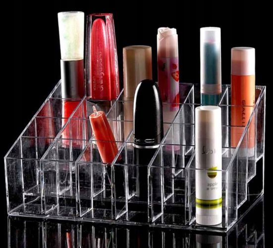 Практичный, выполнен из прозрачного материала пластиковый органайзер для помад, подводок, карандашей для глаз, небольших лаков для ногтей или кистей для макияжа. Это позволяет легко и практично организовать вашу косметику. Имеет 24 отделения.
