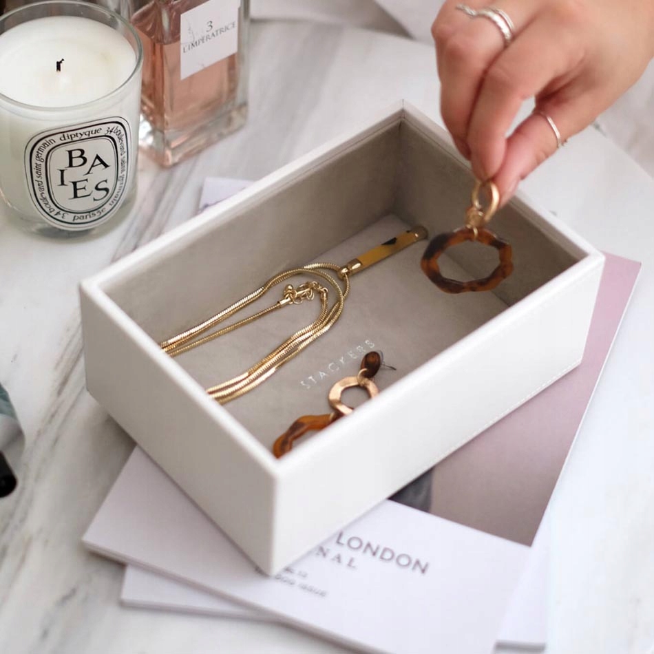 Органайзер Mini Stackers белого цвета отделан экокожей. Его внутренняя часть отделана мягким бархатом, который защищает аксессуары и украшения от повреждений во время хранения. .