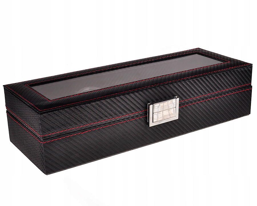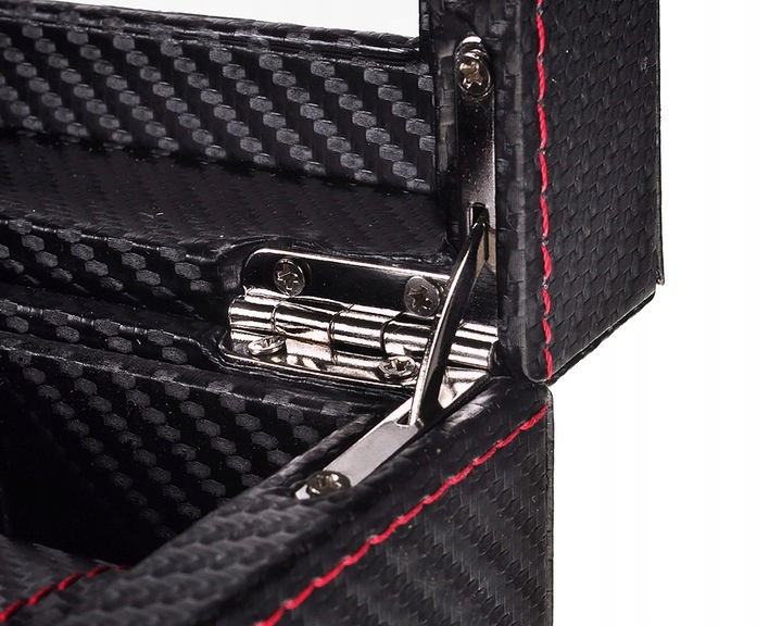 Надежная, элегантная коробка для 6 часов. Отделка выполнена из карбонового материала и элегантной красной нити. В нем можно хранить часы или, сняв подушку, украшения или другие мелкие предметы.