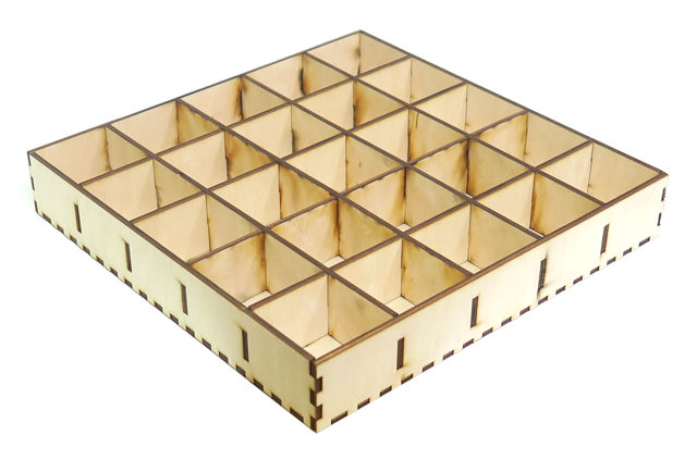 Ящик из фанеры толщиной 3 мм с 25 отделениями с внешней размеры: 21,8х21,8х3,5см.
