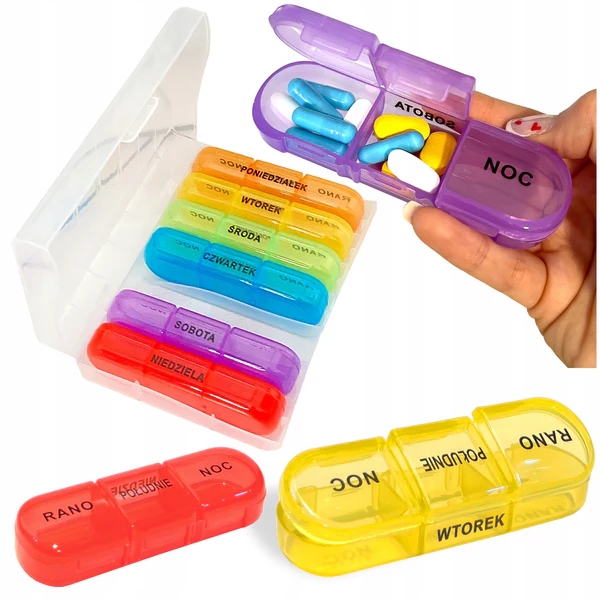 Еженедельный организатор для лекарств - это незаменимый инструмент для людей, которым необходимо регулярно принимать лекарства. Благодаря красочным контейнерам с большими надписями в польском организация лекарств становится проще и прозрачной. Идеально подходит для пожилых людей и людей, которые нуждаются в систематической дозировке наркотиков