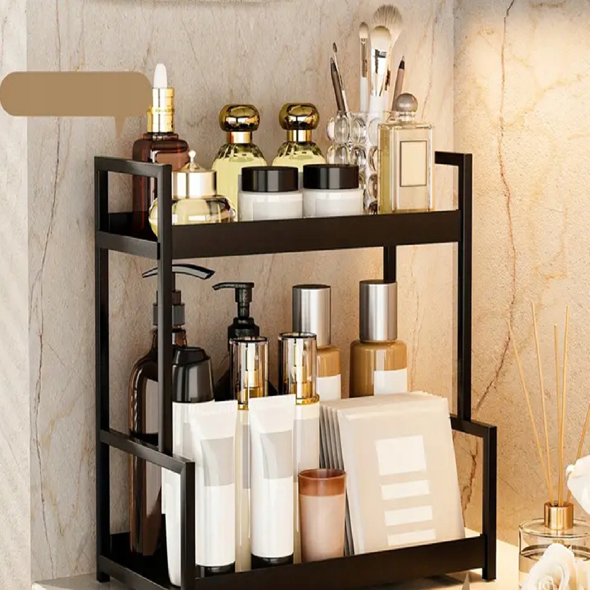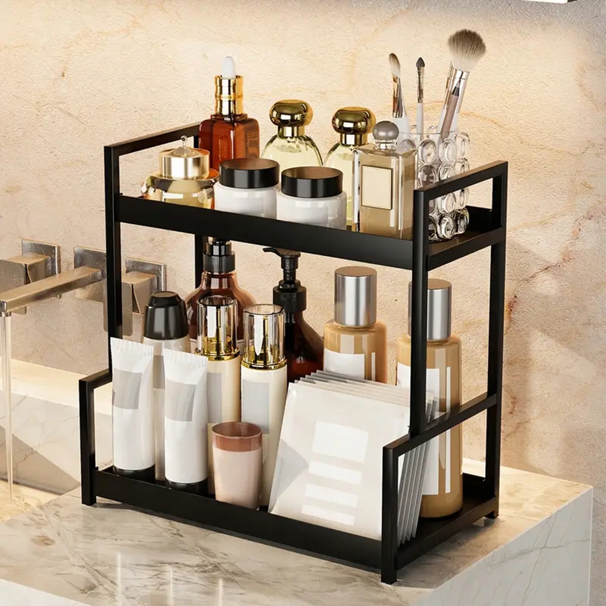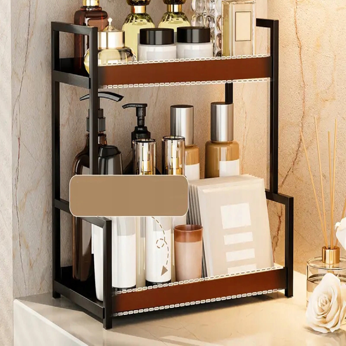 🌟 Компактная двухслойная конструкция: Двухслойная конструкция максимально увеличивает вертикальное пространство и позволяет хранить предметы различных размеров. Органайзер для косметики имеет размеры 40 х 22 х 39 см и поможет содержать в порядке рабочие поверхности — от баночек со специями до косметики.