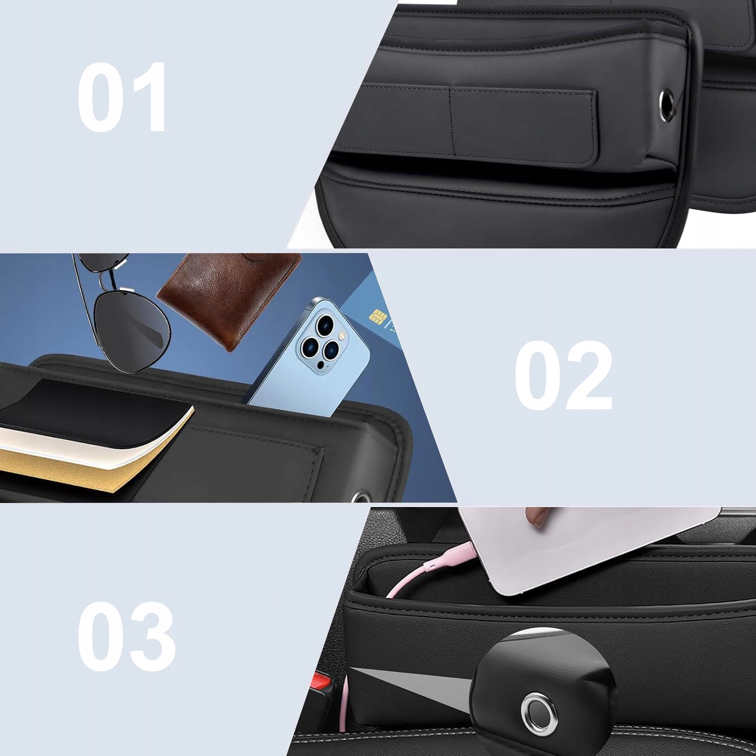 - Может сэкономить много времени, чтобы найти такие объекты, как сотовые телефоны, которые упали между сиденьем и центральной консоли, а также сохранить пространство. >