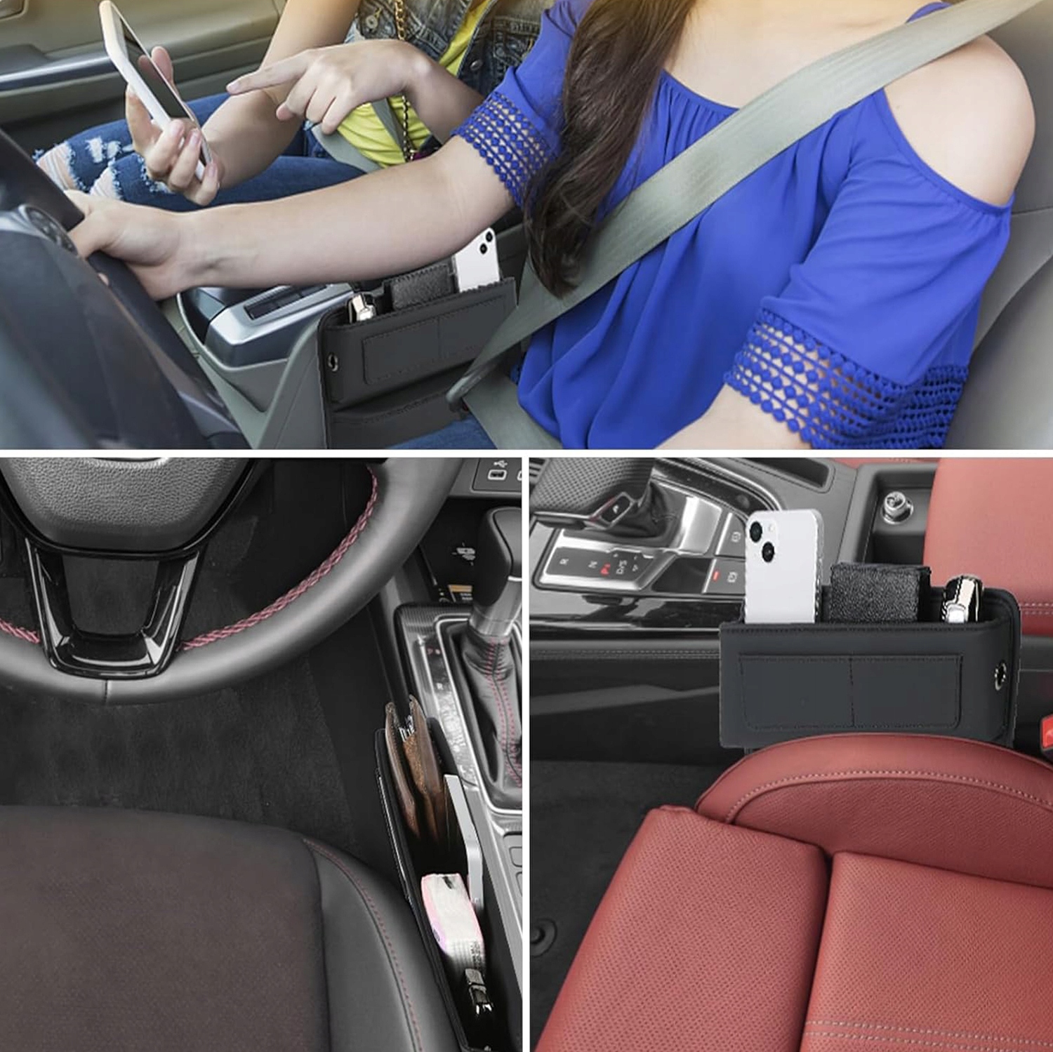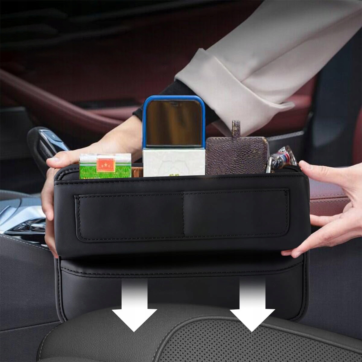 - Ящик для хранения в автомобильном сиденье удобна и мягкая, имеет красивый вид, долговечен и прочный и не делает Звук во время втирания объектами, который подчеркивает общий стиль автомобиля. Разрыв на автомобильном сиденье может эффективно предотвратить мобильный телефон, ключи и другие мелкие предметы в промежутке сидений, обеспечивая безопасность вождения