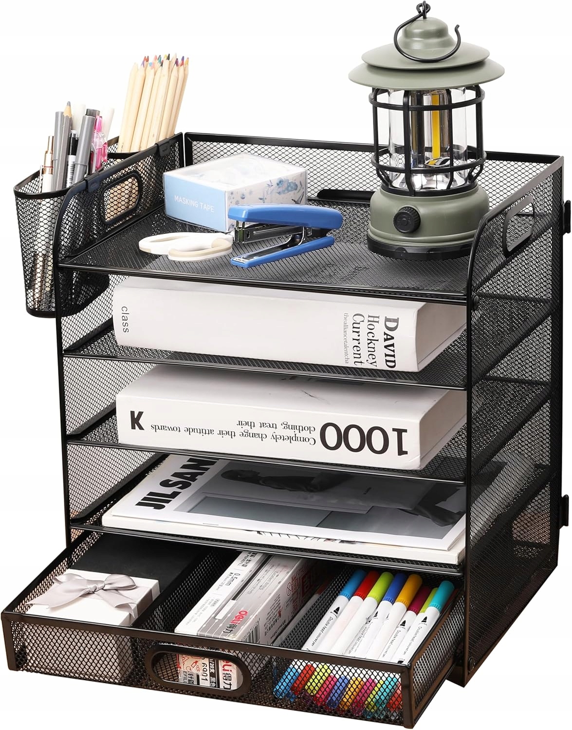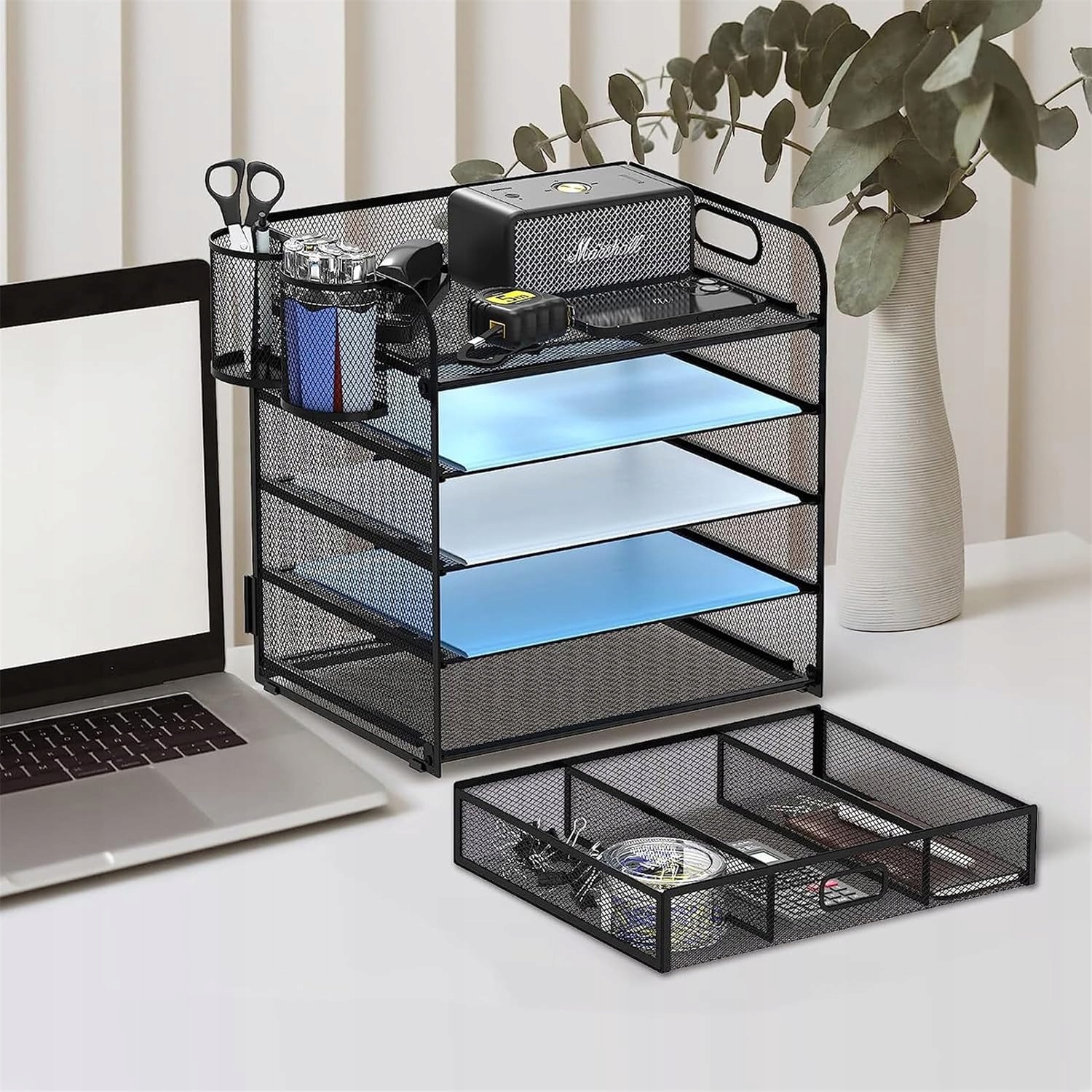 Организатор Essosway – идеальное решение для всех, кто ценит аккуратность и порядок. Благодаря многофункциональному дизайну и практичному ящику вы можете легко хранить как большие документы, так и небольшие офисные принадлежности. Благодаря дополнительным держателям для ручек все ваши принадлежности будут под рукой.