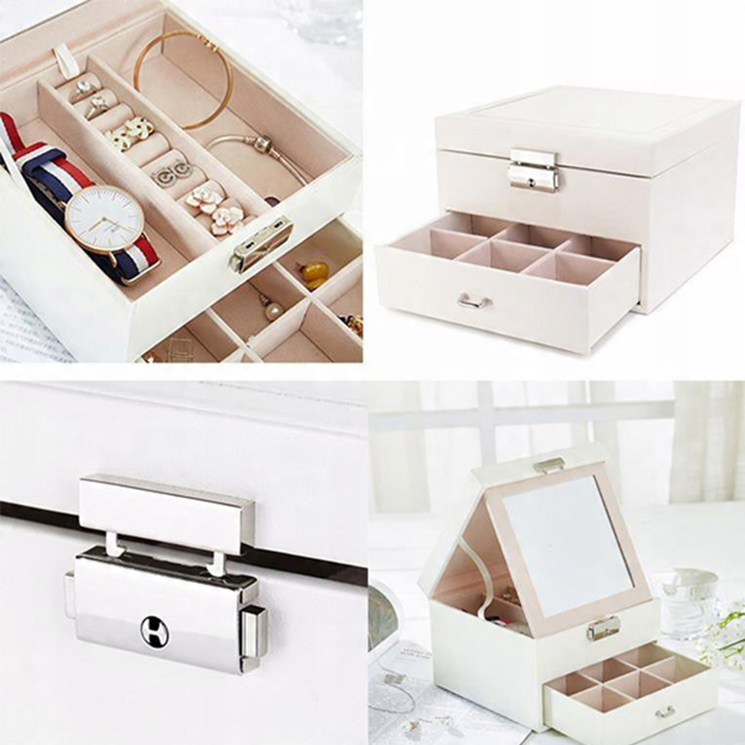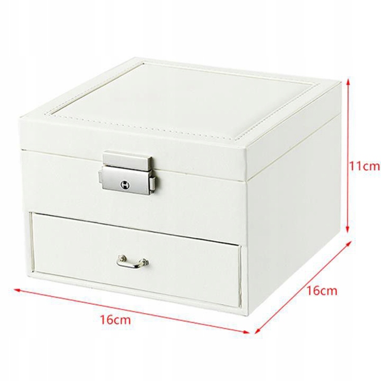 Внутри коробки находится наклоняющееся зеркало, которое идеально подходит для нанесения макияжа или просто надевания украшений. Под ней находится потайное отделение для самых ценных украшений. Шкатулка имеет выдвижной нижний ящик с девятью отделениями, благодаря которым в них можно поместить все ваши серьги! Ящик также можно вынуть из коробки.