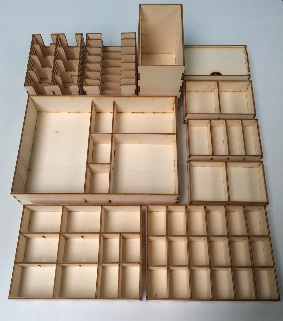 Пространство в лотках для фигурок можно персонализировать, уменьшив или увеличив размер отделений. Вставка изготовлена из высококачественного материала HDF и проста в сборке, хотя и требует много времени. Рекомендуем использовать столярный клей «Викол».