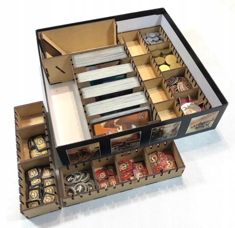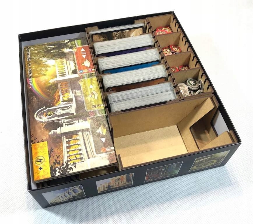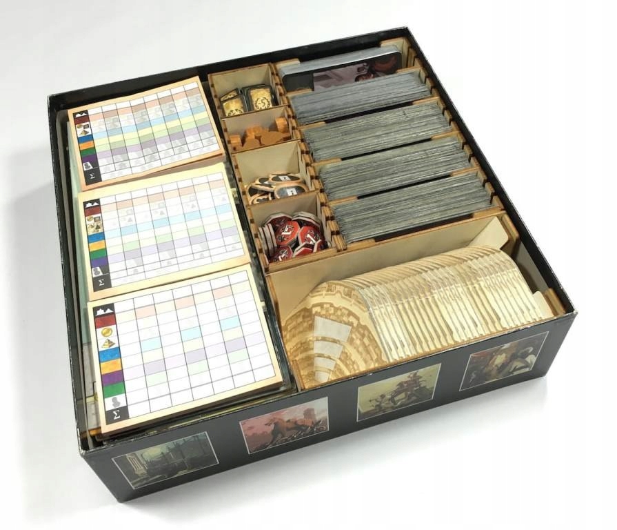 Вкладыш, который идеально вписывается в игру 7 Чудес. Вставка вместит в себя все элементы как из базовой версии игры, так и из дополнений: «Лидеры», «Города», «Вавилон» и «Чудо». Все карты можно хранить в футлярах.