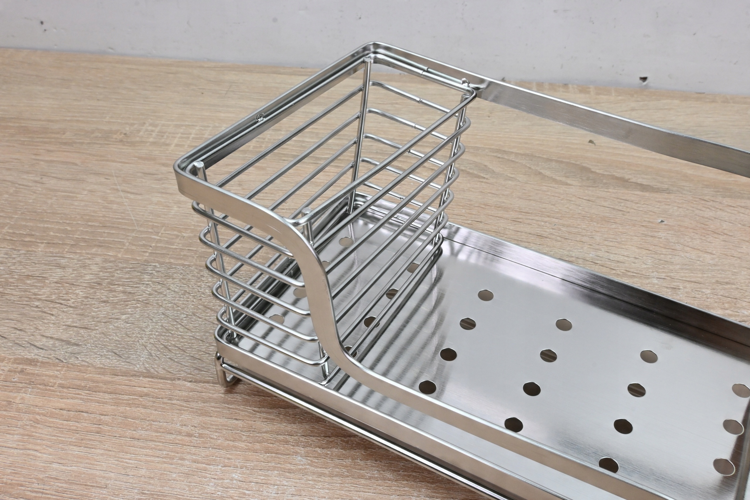 Кухонный органайзер Oriware изготовлен из металла и имеет съемный пластиковый поднос. Имеет встроенную корзину, например, для мытья щеток.