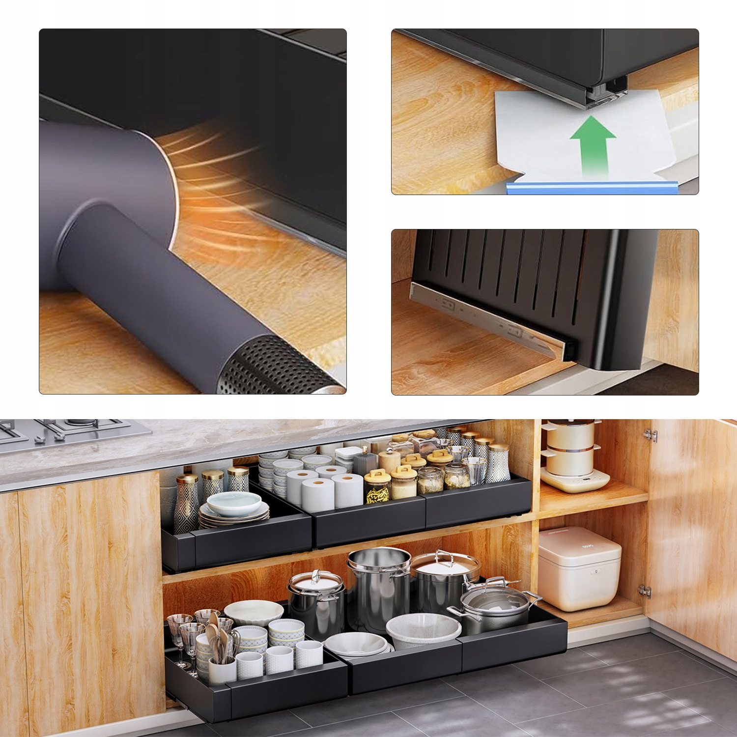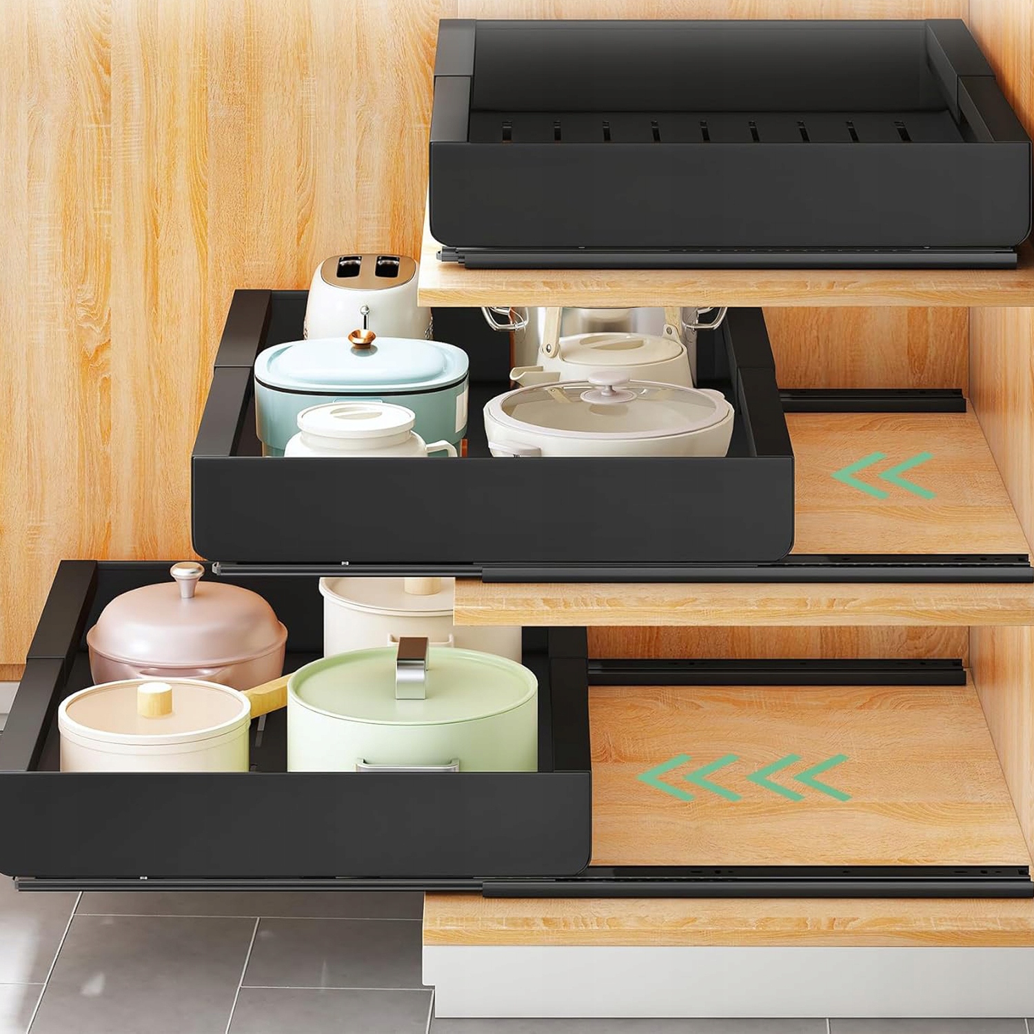 - Полностью выдвижной механизм расширяющегося обеспечивает прозрачный обзор содержимого шкафа, облегчая доступ к горшкам, столовым приборам, чистящим средствам, джемам и другим вещам.