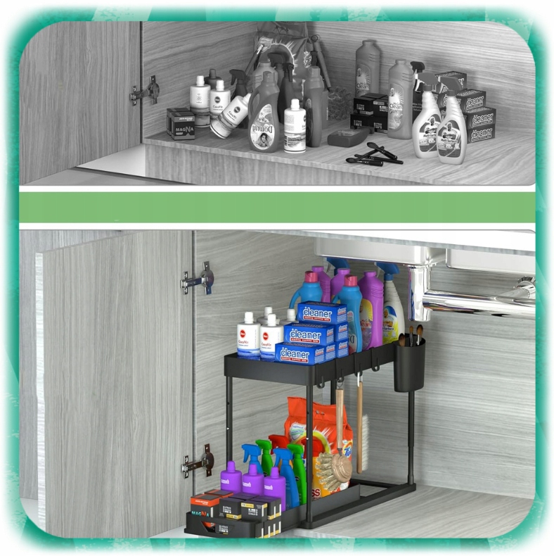 ✅ Под раковиной обычно царит хаос – бутылки падают, губки и тряпки теряются в глубине шкафа, а вы теряете время на поиски.