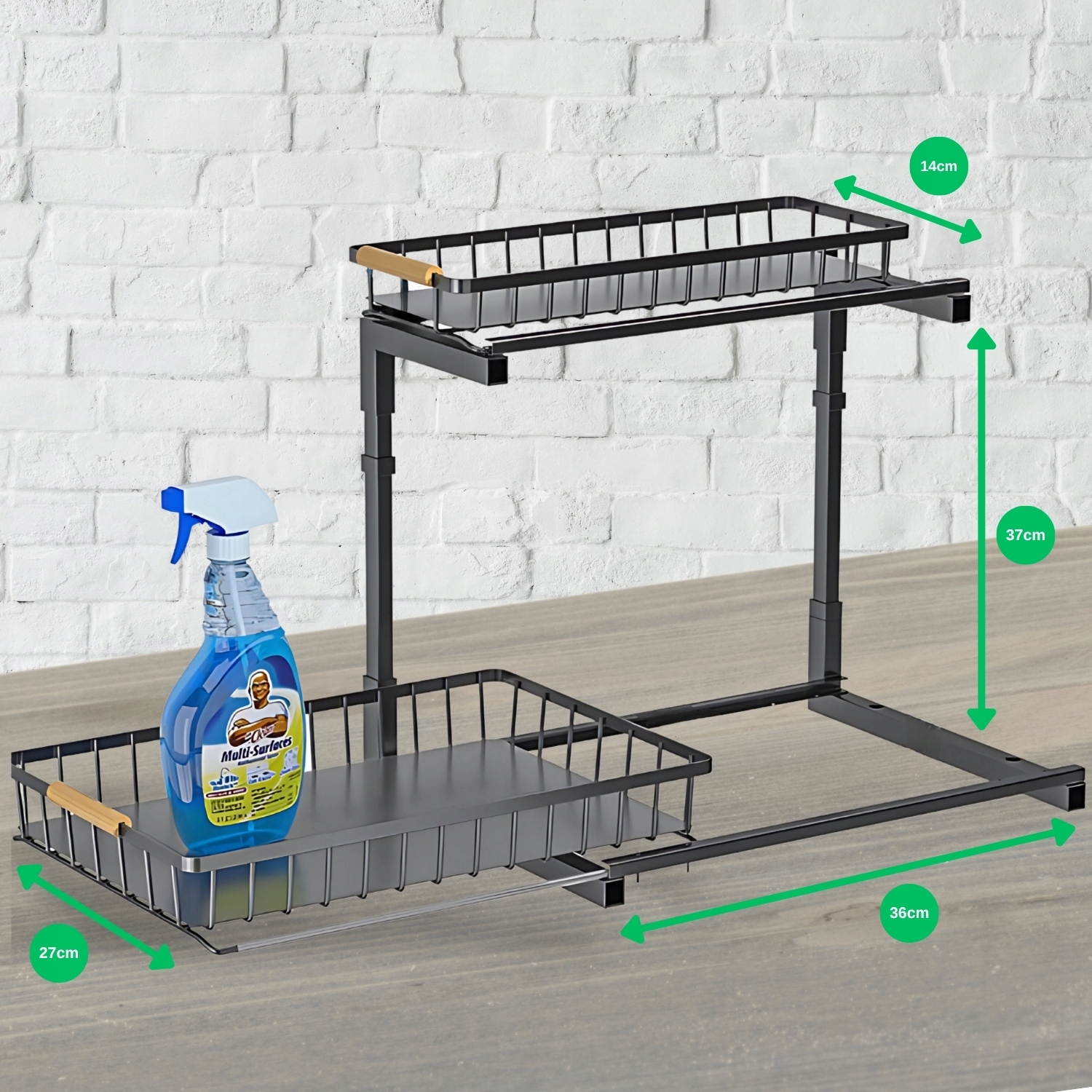 Позаботьтесь о заказе в твердых местах -решающих местах благодаря двумуровне -организатору под раковиной . Изготовленный из прочного металла, выдвижной и многофункциональный , он работает как на кухне, так и на ванной, кладовой или в утилите.