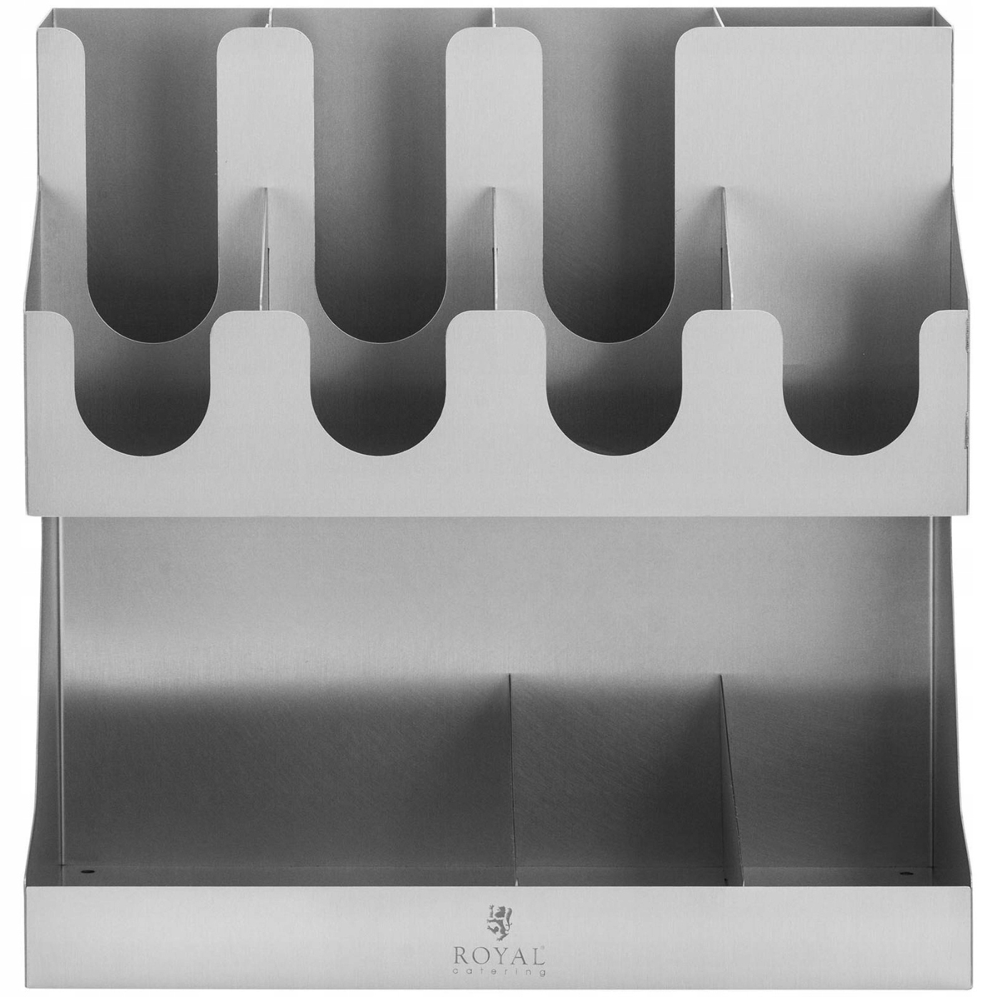 Что вы хотите: черный кофе или кофе с молоком и сахаром? В практичной подставке для чашек, крышек и других аксессуаров можно разместить все необходимое для напитков на вынос. Органайзер Royal Catering имеет 11 отделений для сахара, молока, салфеток, палочек для размешивания и т. д. Поэтому компактный диспенсер для одноразовых стаканчиков идеально подходит для закусочных, конференц-залов, залов ожидания или офиса.