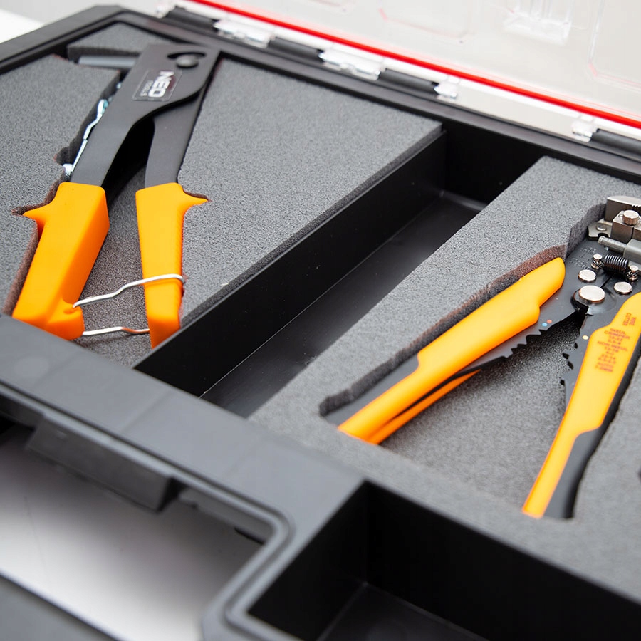Новая версия MFI оснащен многослойными пенопластовыми вставками, которые после вырезания соответствующих отверстий прекрасно защитят ручной инструмент и электроинструмент. Кроме того, уплотнитель, встроенный в крышку из поликарбоната, обеспечивает полную защиту от проникновения воды и пыли.