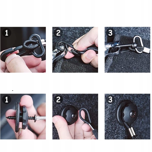 Сетка имеет 4 точки крепления с карабинами. Резинка, расположенная по периметру сетки, позволит подогнать ее под размер багажника.