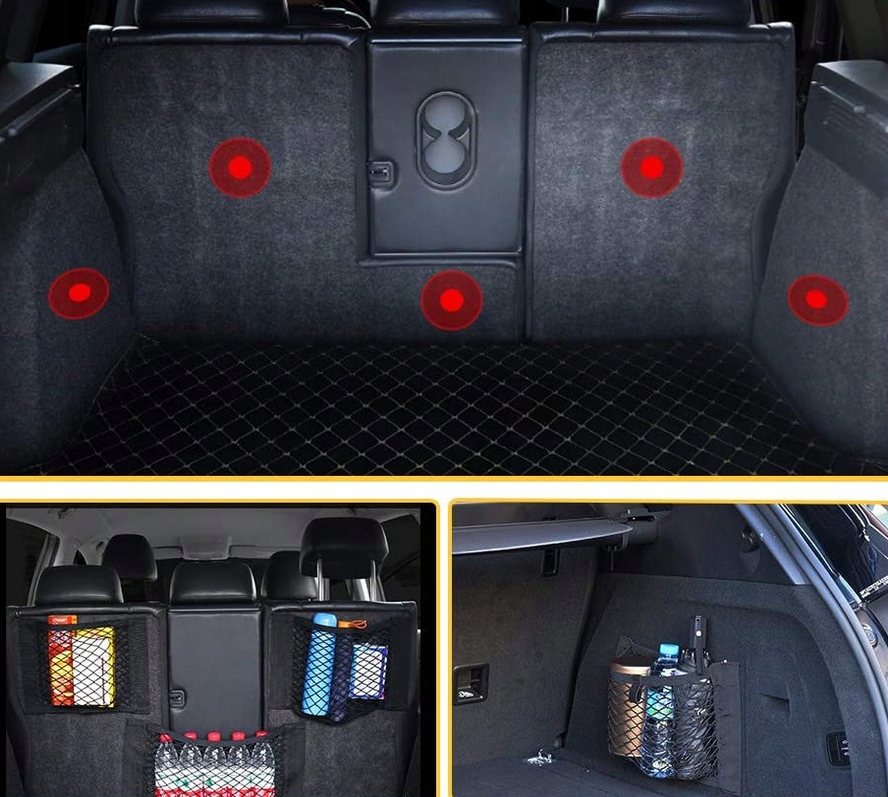 Сетка – идеальное решение, если вам не хватает отделений для хранения автомобильных аксессуаров. Благодаря небольшому размеру его можно приклеить во многих местах (багажник, за спинку сиденья, за колесную арку, на бархатные коврики