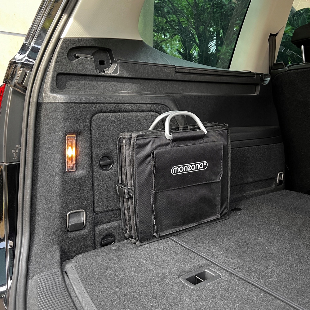 качественный автомобильный мешок с отсеками Monzana® изготовлен из водонепроницаемой, устойчивой к царапинам и атмосферным условиям полиэстера Оксфорда 1680D.