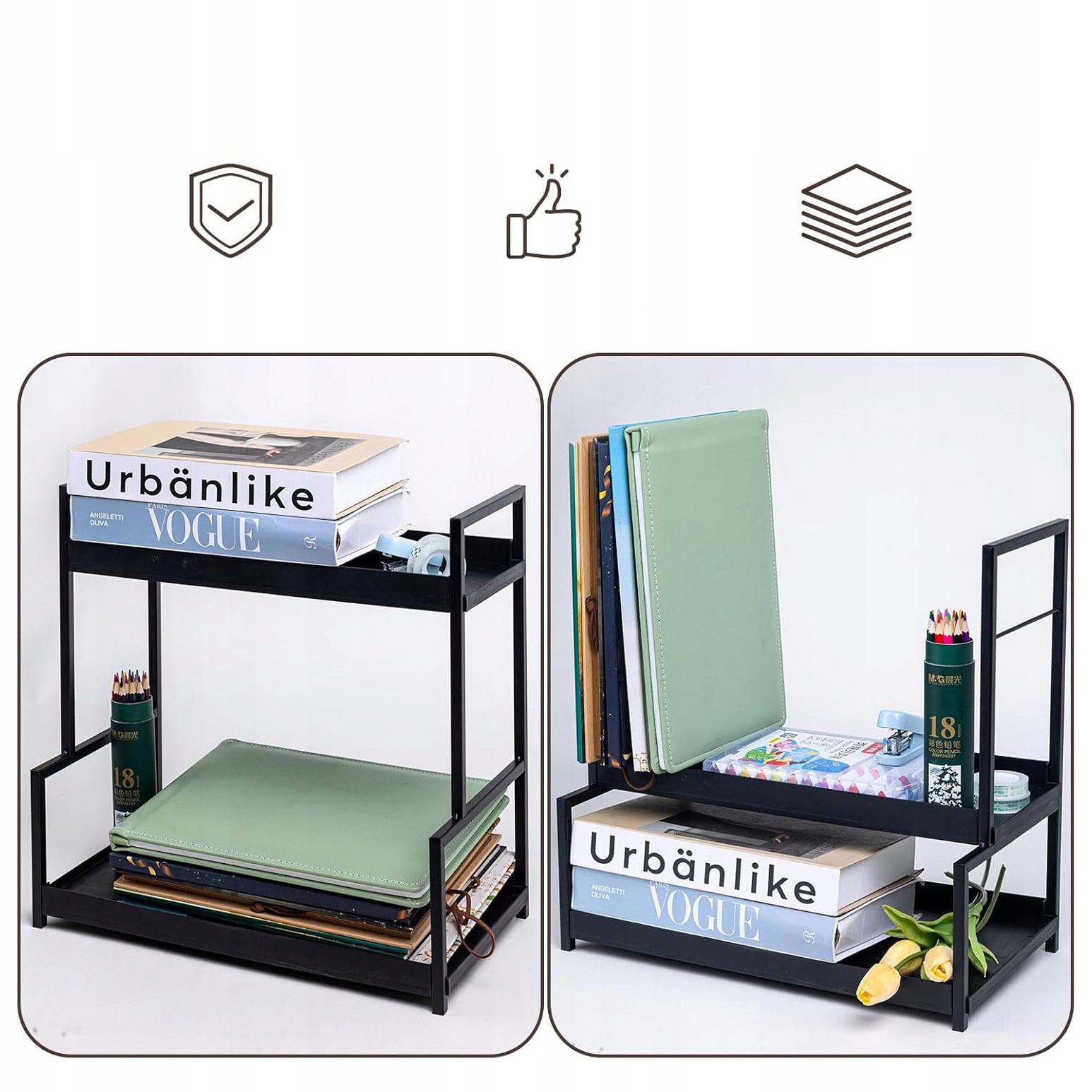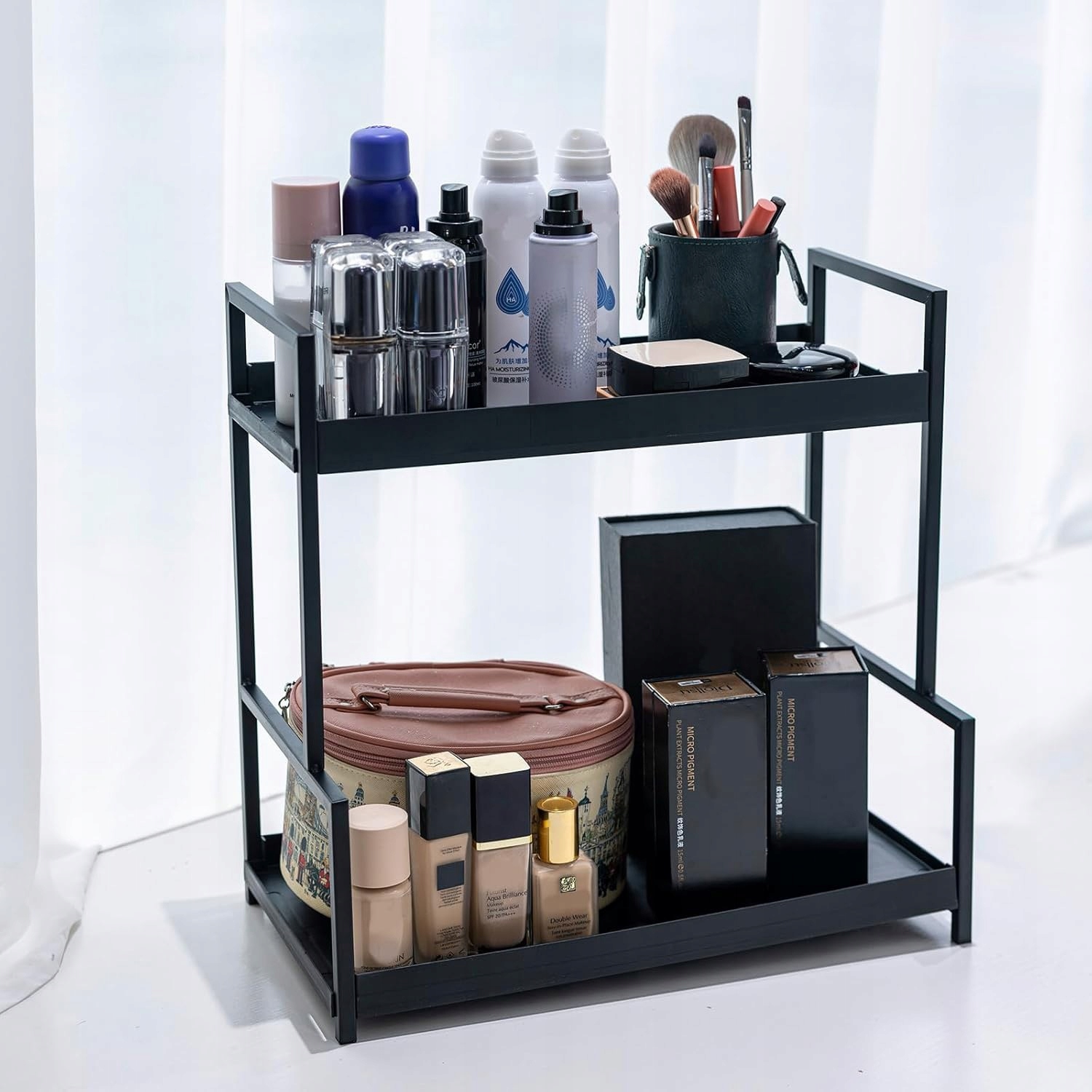 ✅ Двухлетние пространство для сохранения структуры: Две -слойная структура максимизирует вертикальное пространство и позволяет хранить объекты разных размеров. Организатор для Cosmetics имеет размеры 39 x 22 x 40 см и поможет поддерживать порядок на рабочих поверхностях, от банок с специями до косметики.