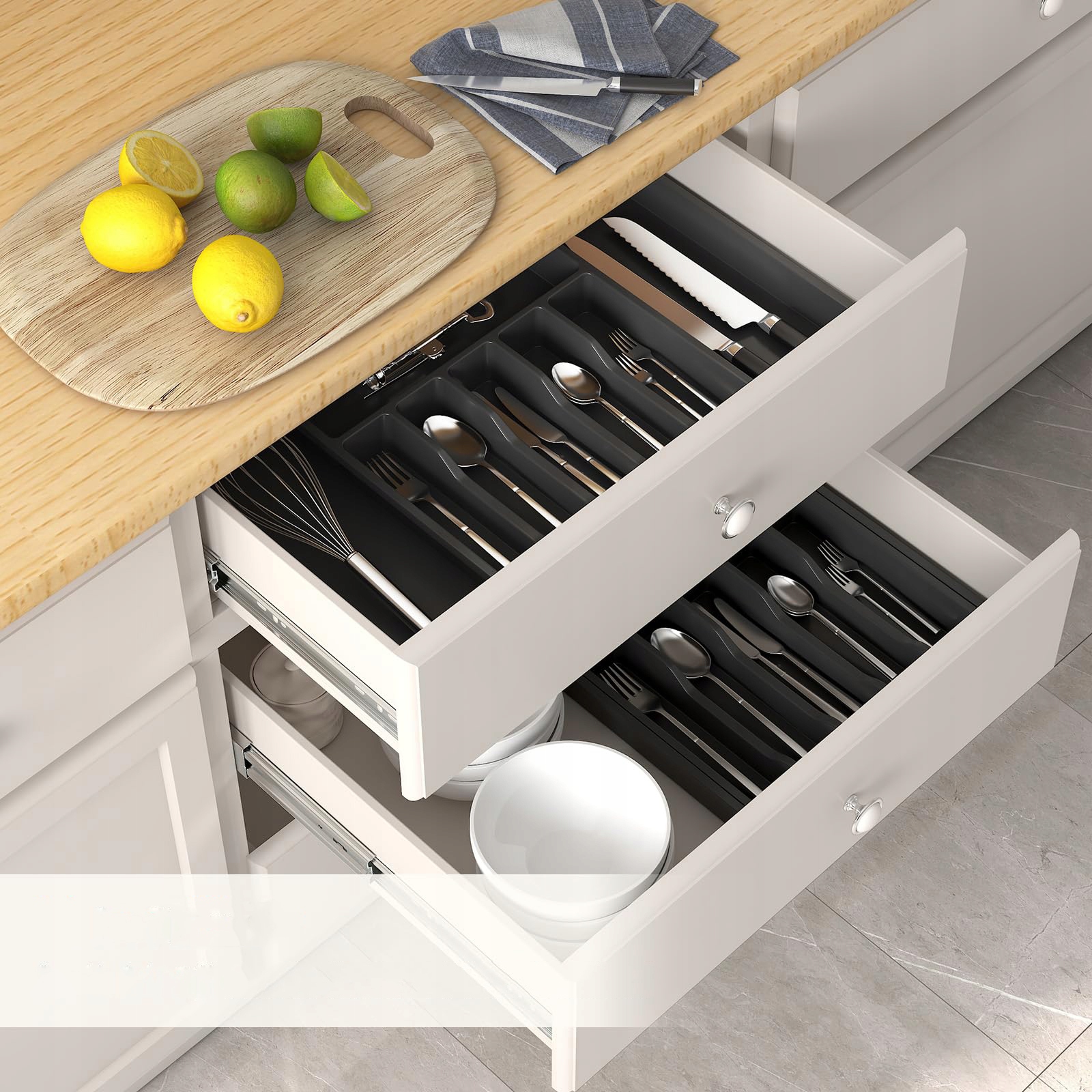 Подносы столовых приборов обеспечивают больше места на кухонной стойке. Благодаря двум расширяемым отсекам слева и справа, вы можете хранить больше столовых приборов и кухонной посуды.