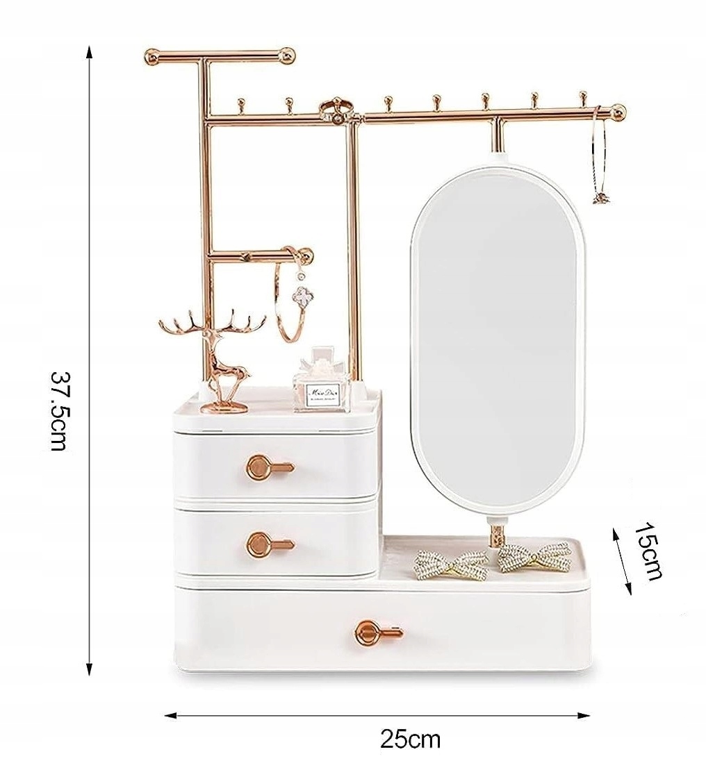 Элегантный дисплей для ожерелий и серьгов в виде хитрой. Расположен на устойчивом основании с ящиками . Он прекрасно работает как подставка для домашнего туалетного столика, а также для магазина выставки. Ювелирные изделия будут выглядеть сенсационными. Ювелирные украшения