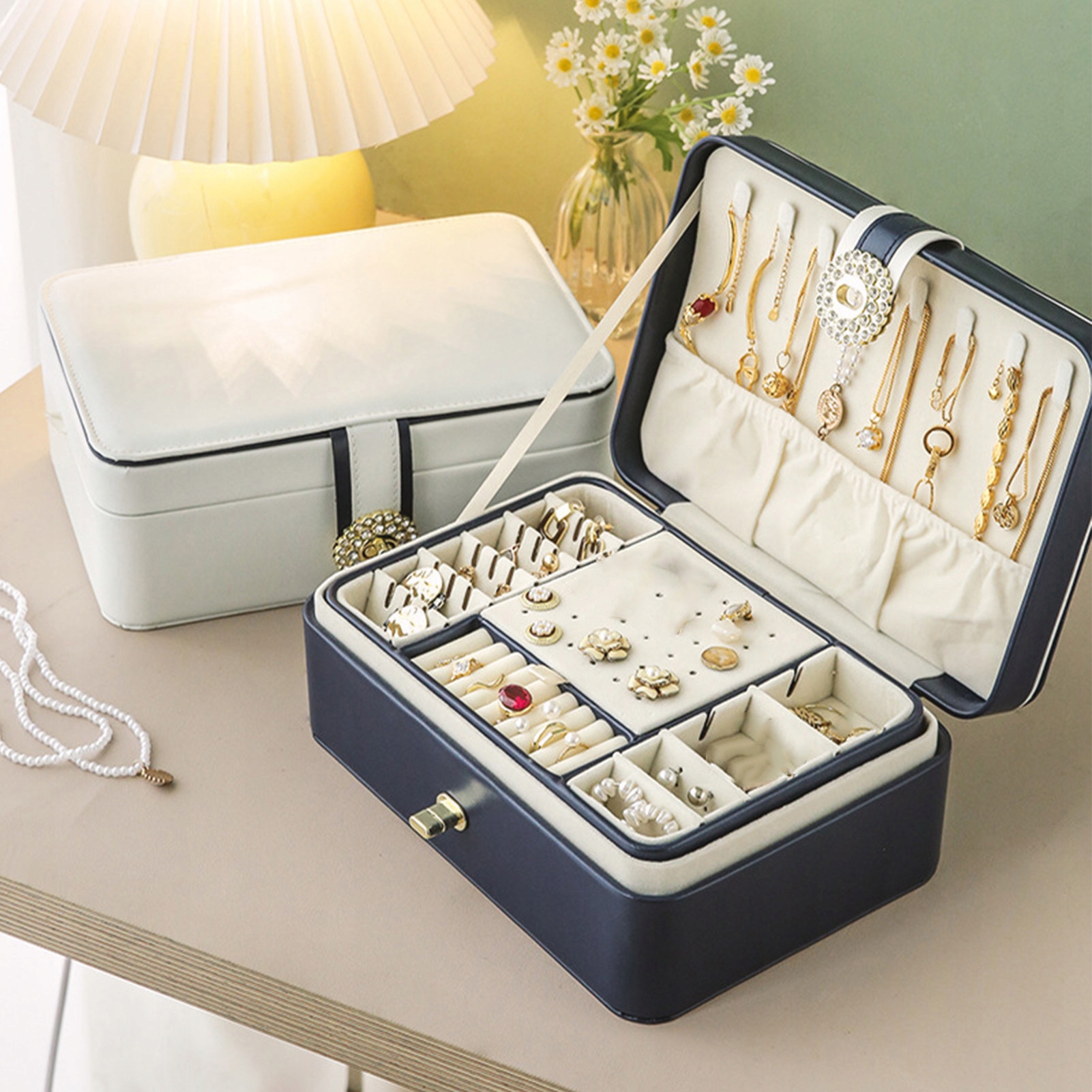 2. Строительство со многими отсеками: секретное хранение браслетов, ожерелья, колец, серьги и других типов ювелирных изделий, обеспечение организации и легкий доступ к ценным аксессуарам.