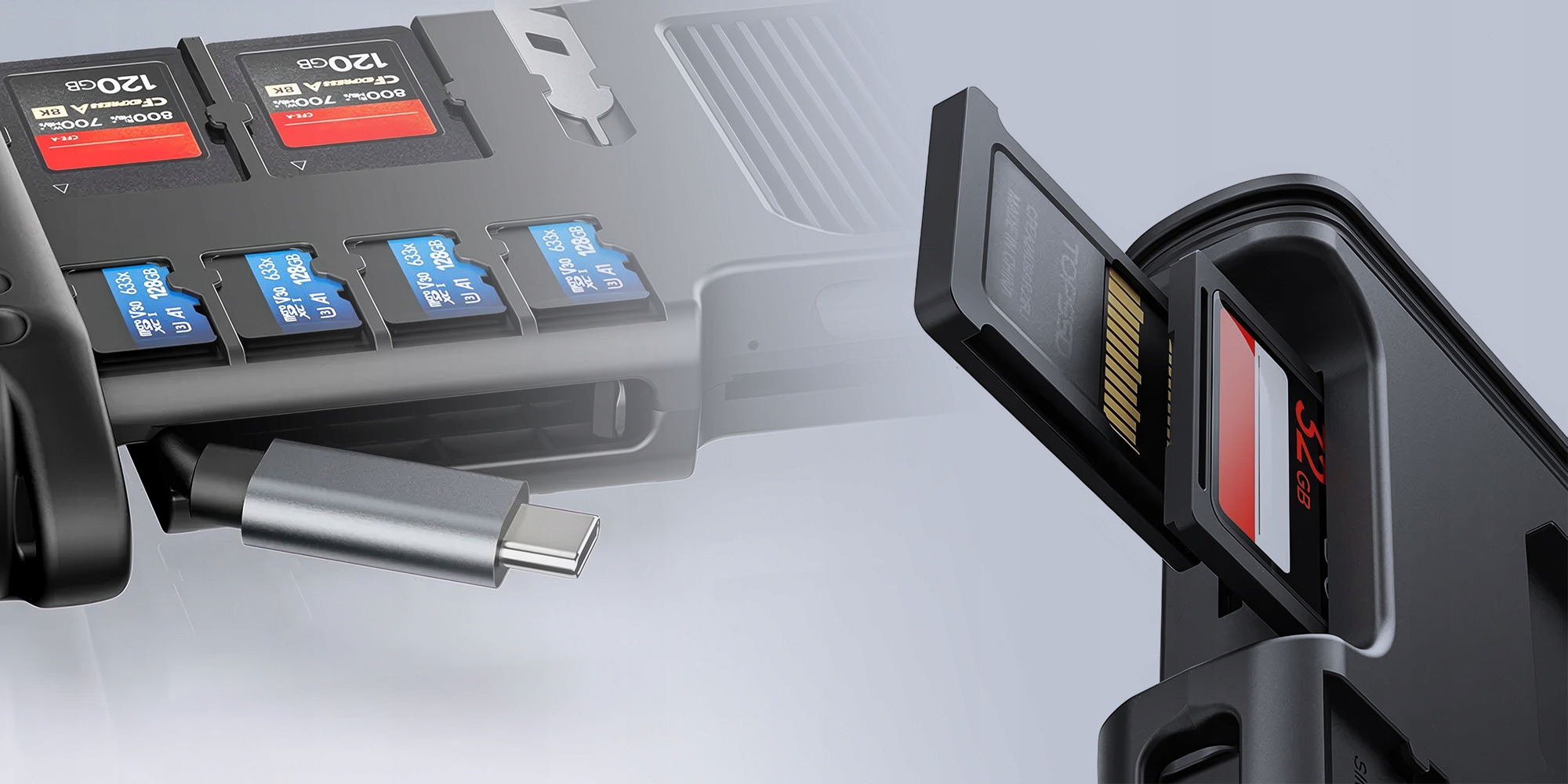 В отдельных продажах вы также найдете считыватель карт MCR-02, где вместо 3 карт CFExpress Type-A вы поместите 2 CFXPress Type-B.