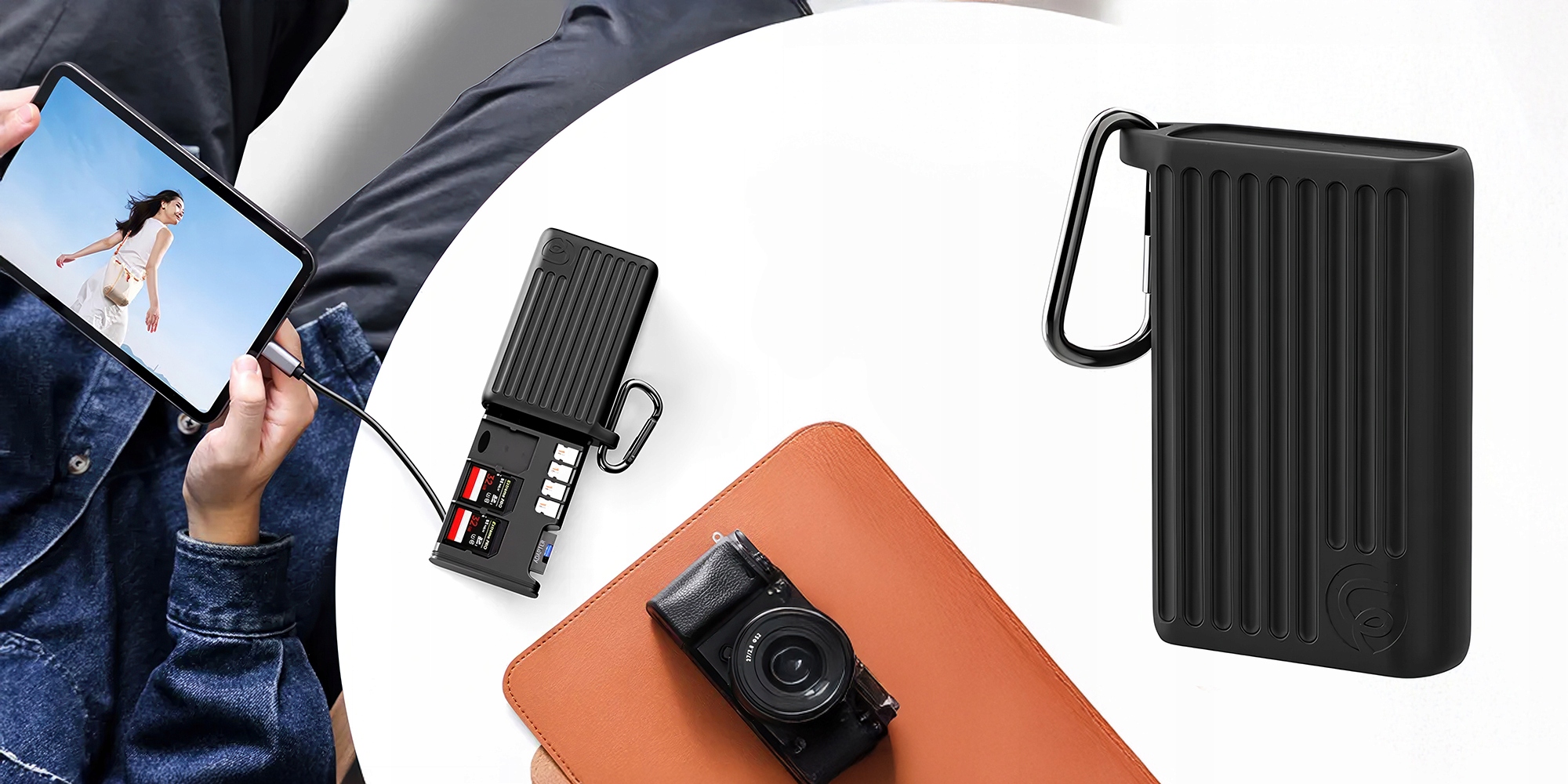 - Включает адаптер MicroSD / SD и SD и карабинер