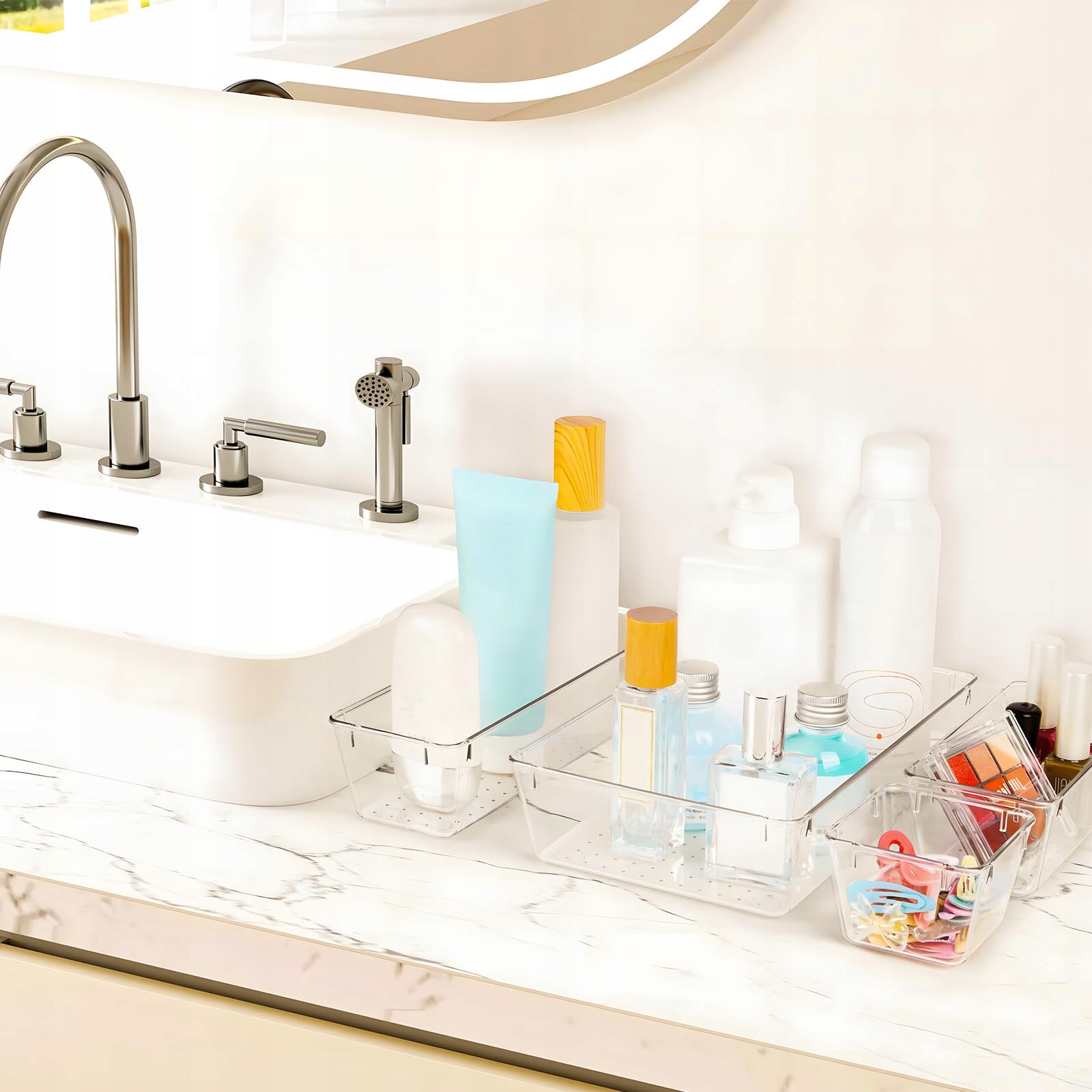 Адаптация к индивидуальным потребностям: на кухне, офисе, в ванной комнате, гостиной или спальне - небольшие предметы хранятся повсюду. Пластиковый организатор для туалетного ящика помогает в стильном заказе. Подходит всем типам ящиков. Идеально подходит для хранения косметики, макияжа, аксессуаров для волос, ювелирных изделий, офисных принадлежностей, инструментов, посуды и т. Д.