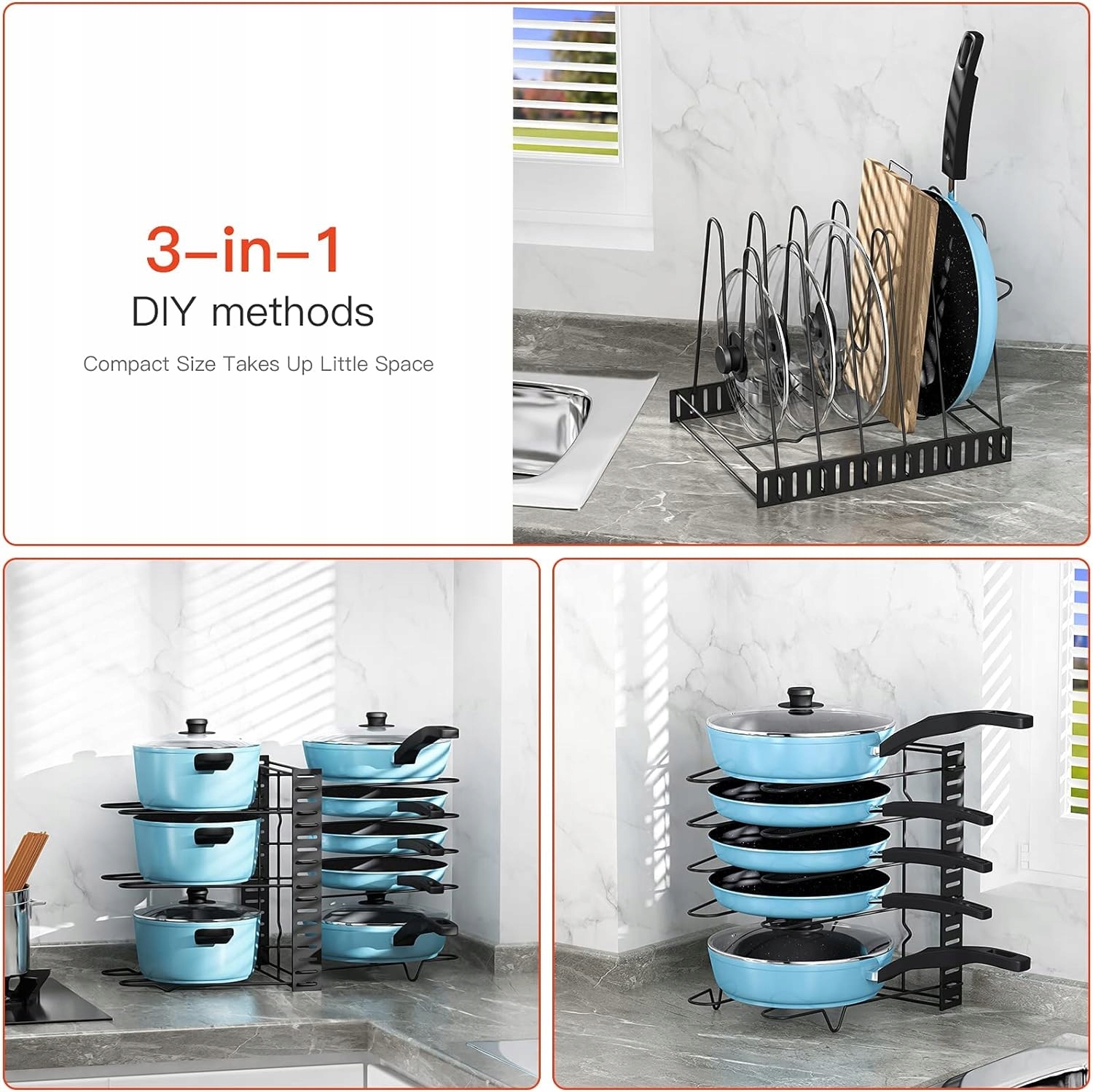 【 Прочность и долговечность 】 — наши подставки для кастрюль изготовлены из высококачественного железа. 8 регулируемых перегородок обеспечивают стабильную и безопасную установку всех типов крышек и кастрюль.