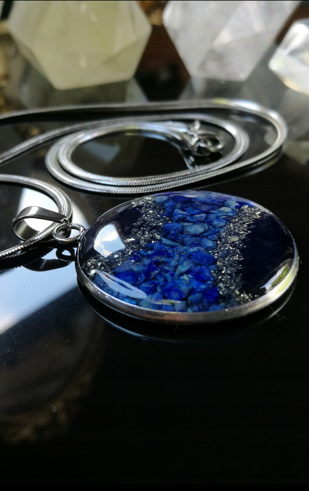 В этом аукционе я представляю оргонит нацепочке из хирургической нержавеющей стали 316L.