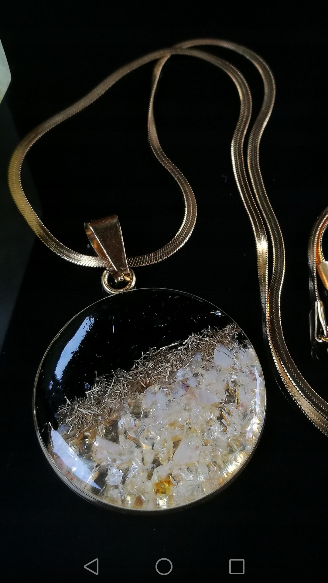 - Чтобы укрепить, предотвращая любые неконтролируемые придурки для ожерелья, в оргоните я использую прочную стальную проволоку, которая является разъемом между ожерельем и подвеской для цепи. Он изготовлен из хирургической нержавеющей стали, которая защищает от случайного разрыва. Это увеличивает эстетические и коммунальные ценности, благодаря тому, что оргонит можно носить с обеих сторон. Каждая сторона оргонита (спереди, задний, задний) имеет свой уникальный рисунок.