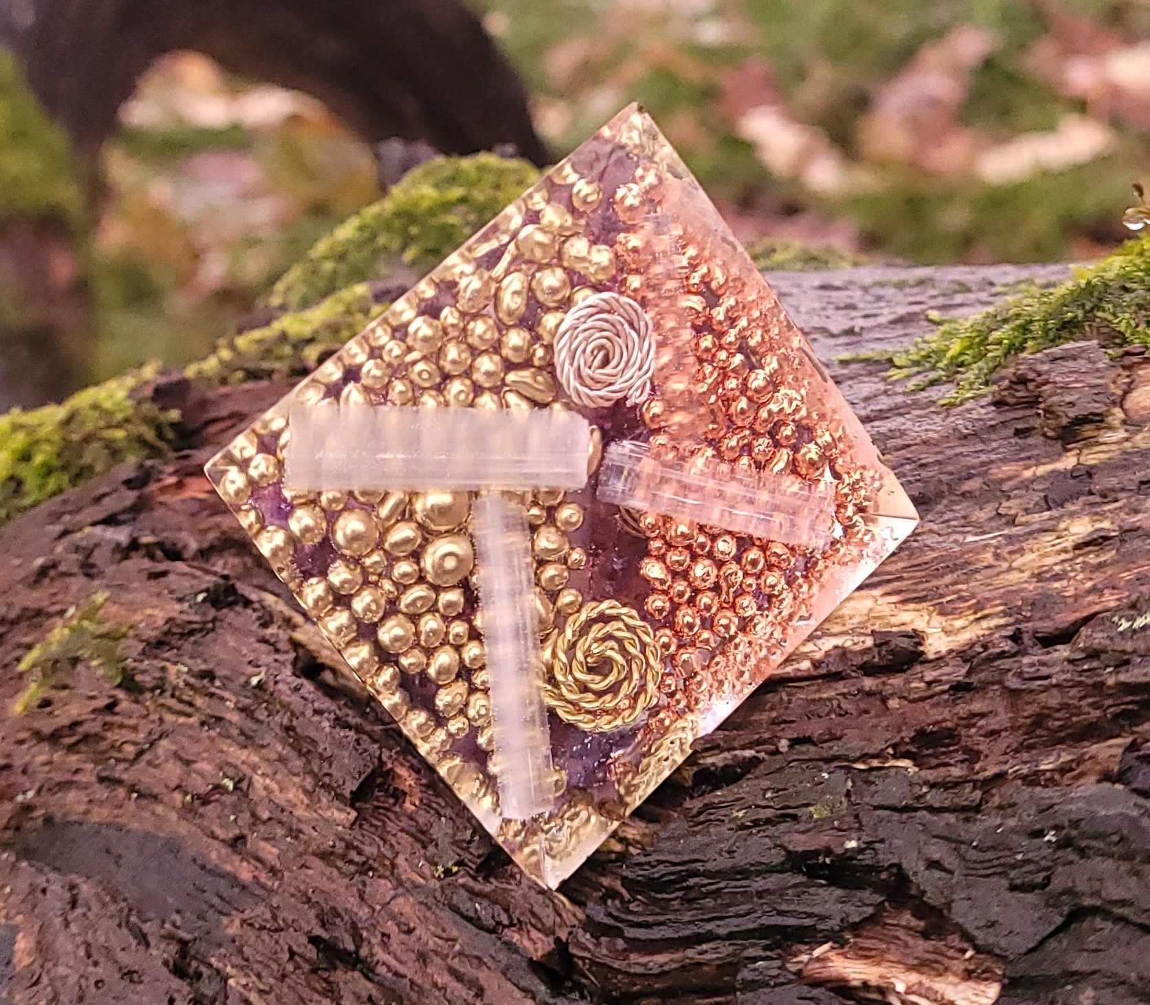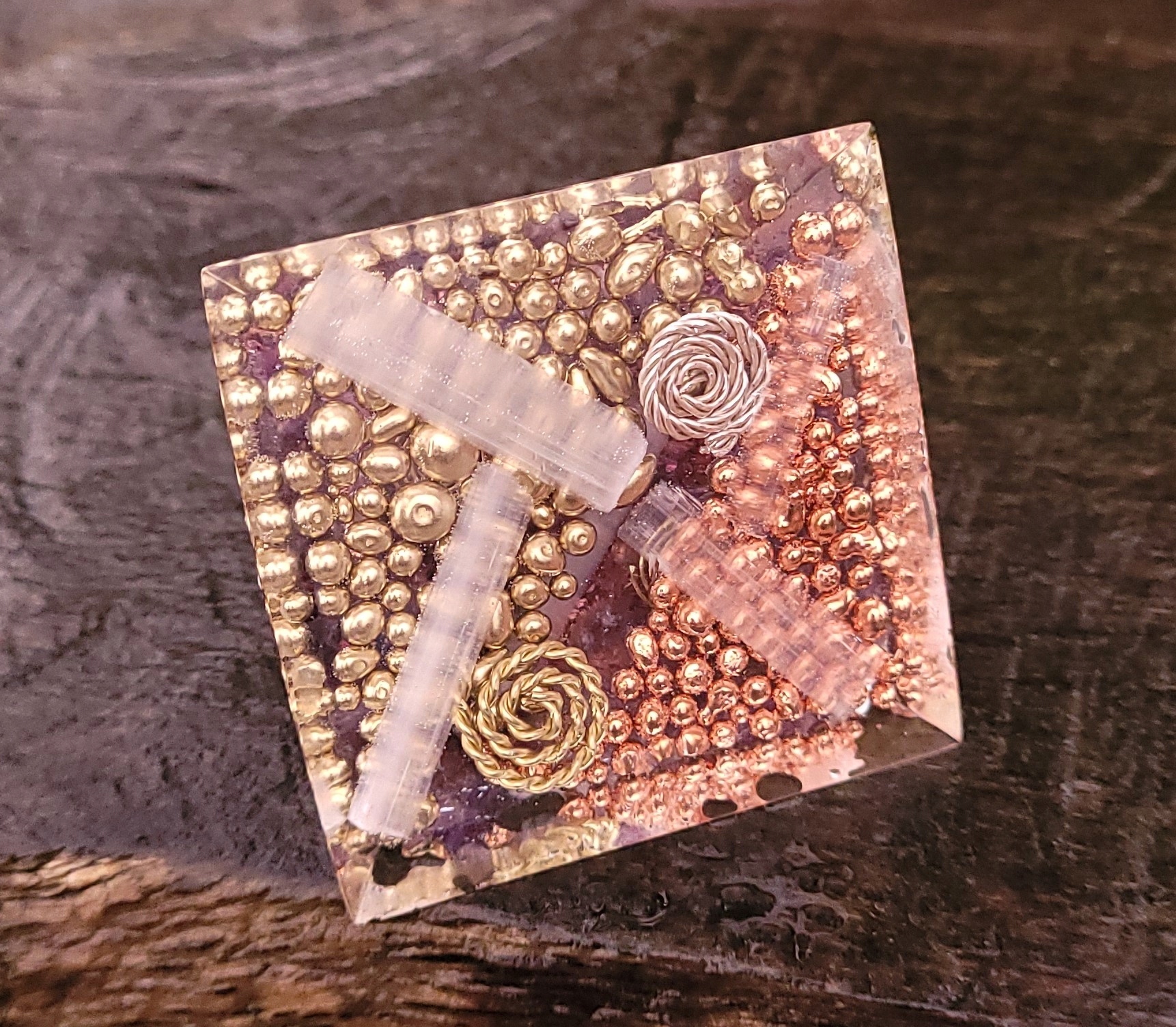 Оргонит — Защитная пирамида — Розовый турмалин Горный хрусталь Пирит Аметист Селенит