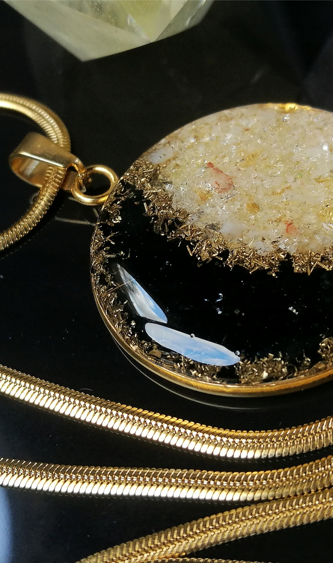 Эксклюзивный оргонит ручной работы, сделанный специальной техникой с ювелирной точностью. Минералы и дополнительные материалы были встроены в органическую смолу.