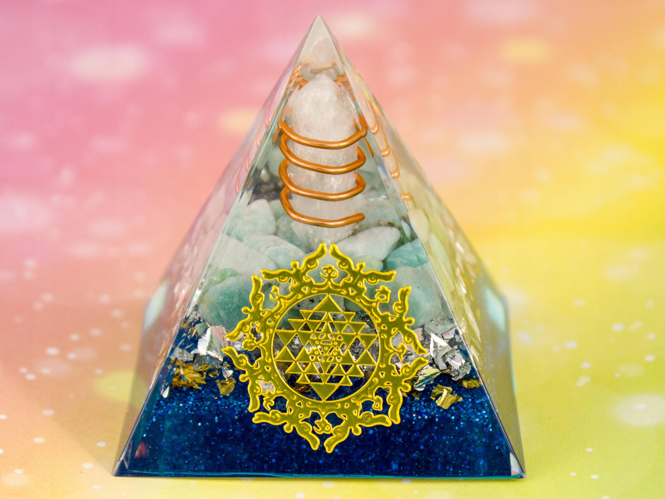 Красивая пирамида из амазонита и кристалла с символом Шри Янтры с комплексным положительным энергетическим эффектом.