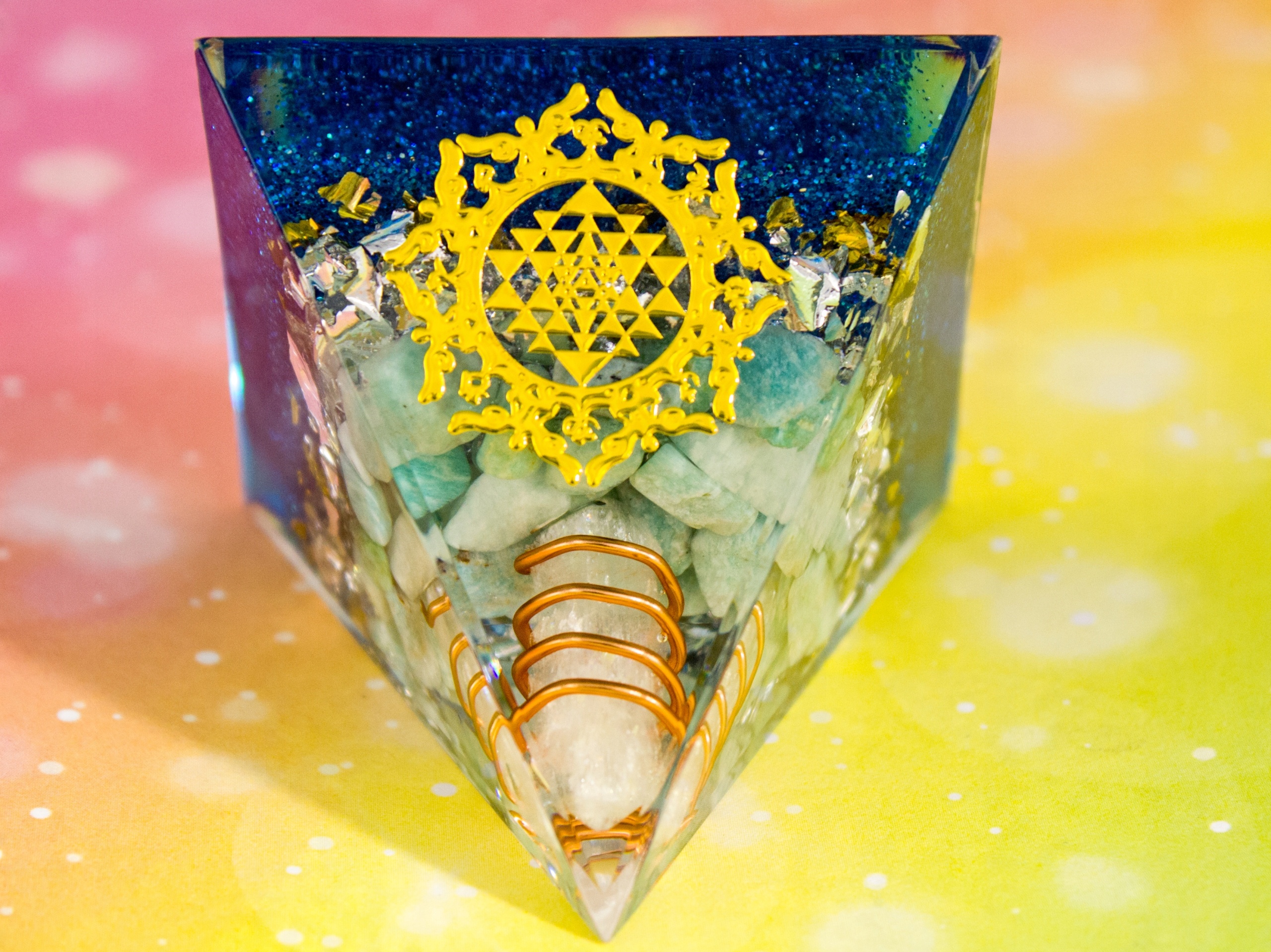 Красивая пирамида из амазонита и кристалла с символом Шри Янтры с комплексным положительным энергетическим эффектом.