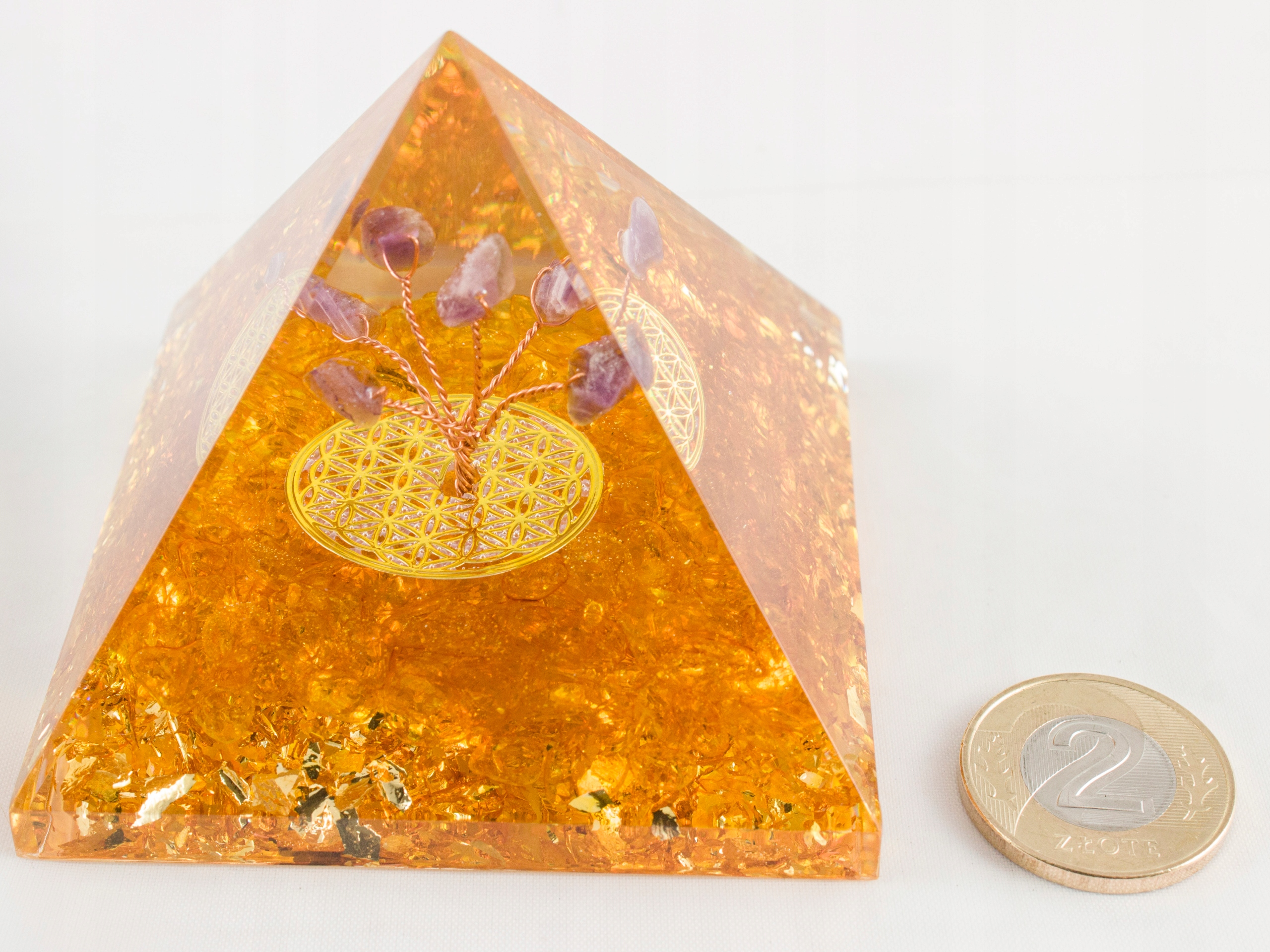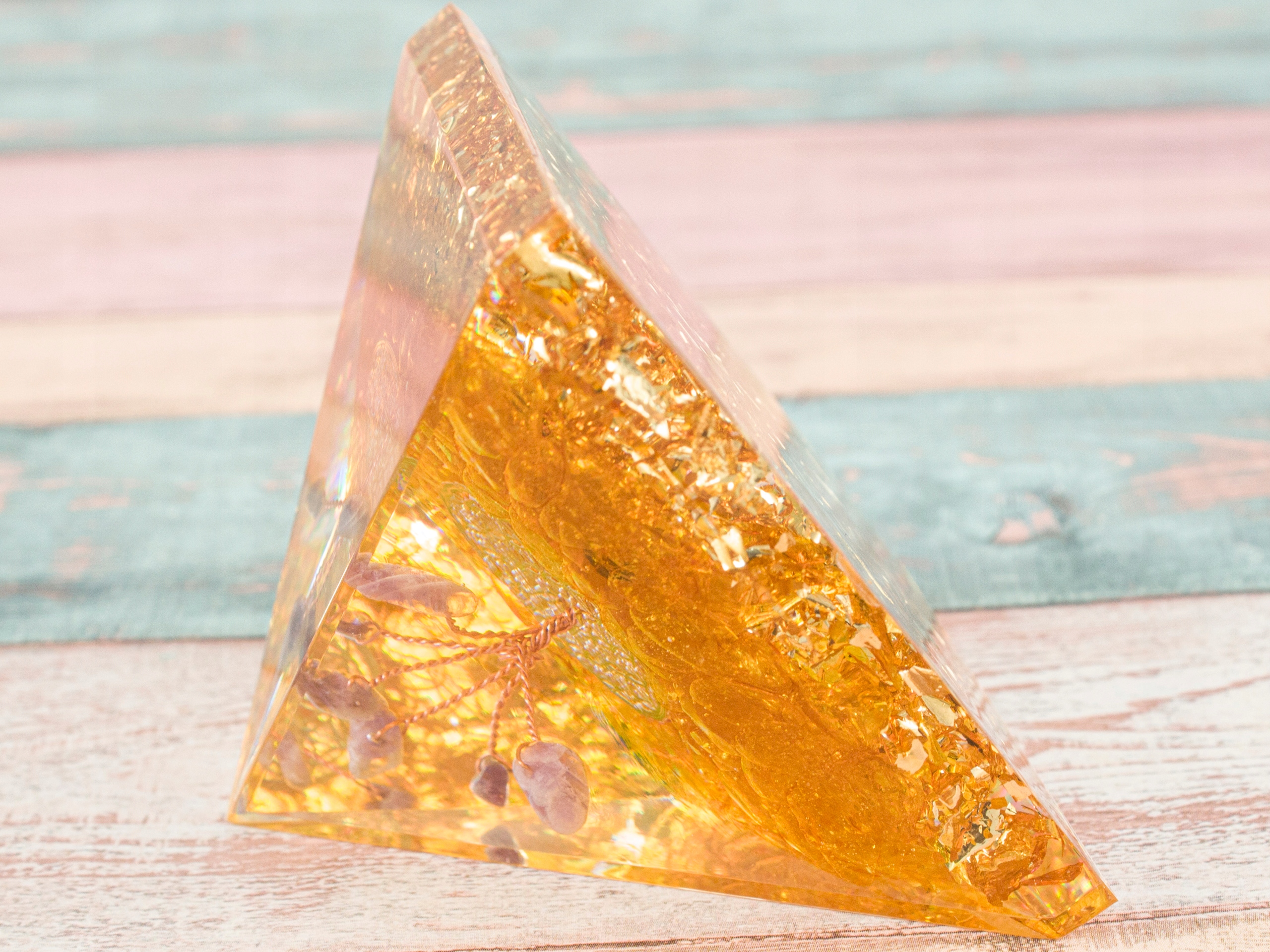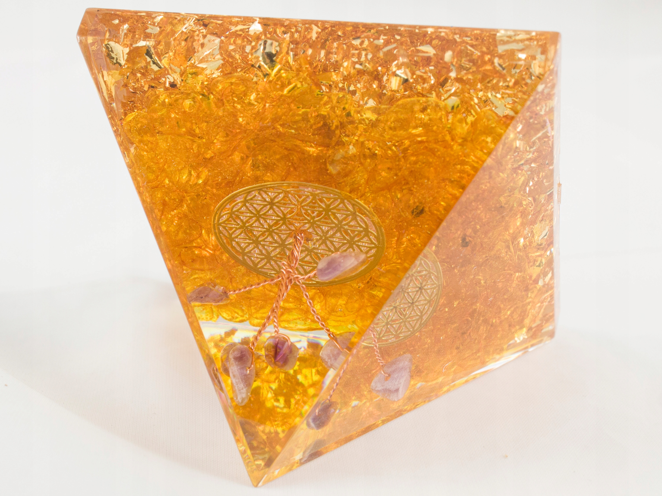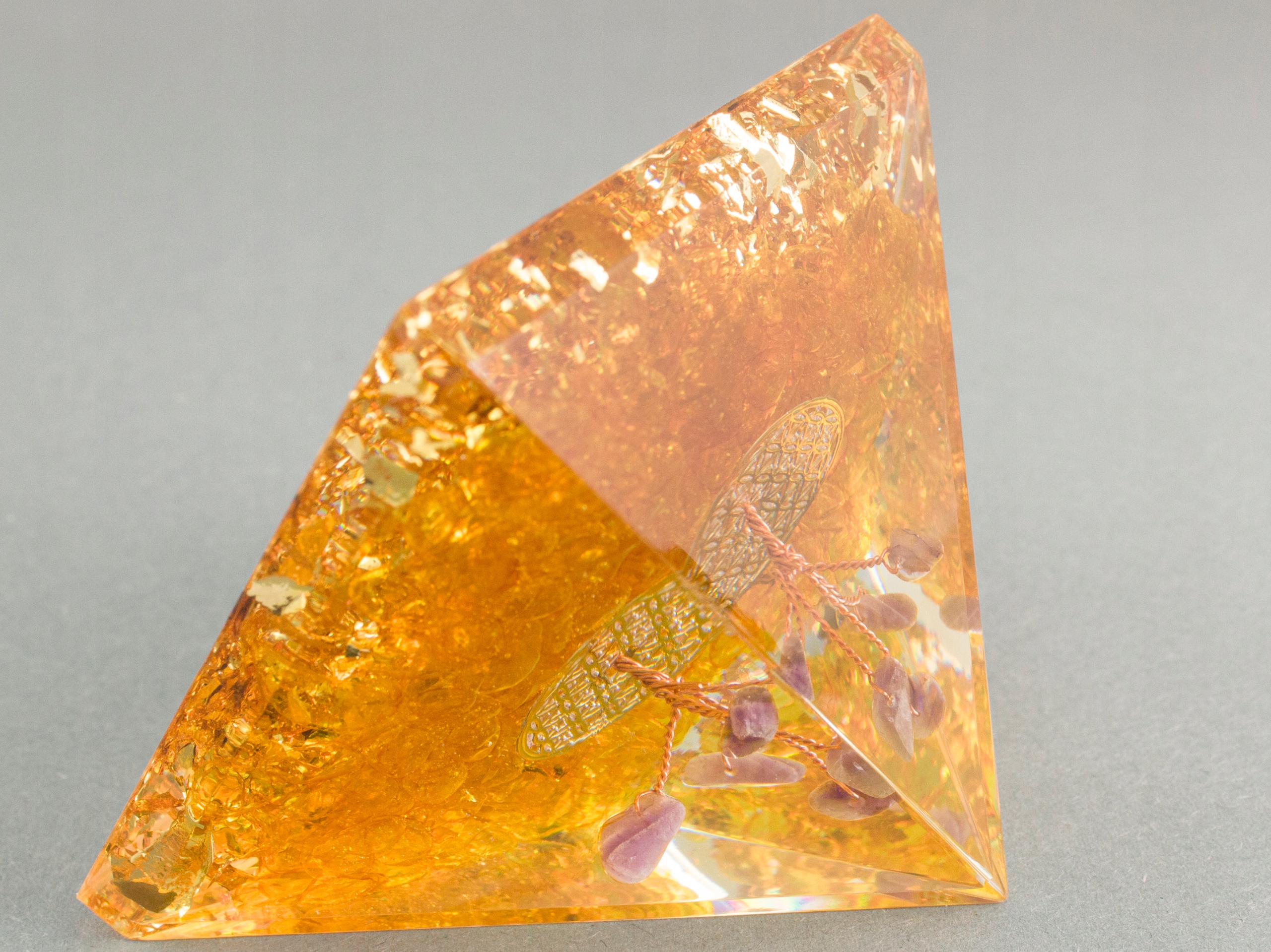 Эта феноменальная пирамида с размерами сторон основания около 6,5 см и высотой 5 см – настоящее произведение энергичного искусства, впечатляющее как своим внешним видом, так и мощью. Изготовлен из прозрачной смолы, наполненной вставками полупрозрачного лимона и золотой, прекрасно пропускает и фильтрует свет, создавая в помещении теплую, солнечную ауру.