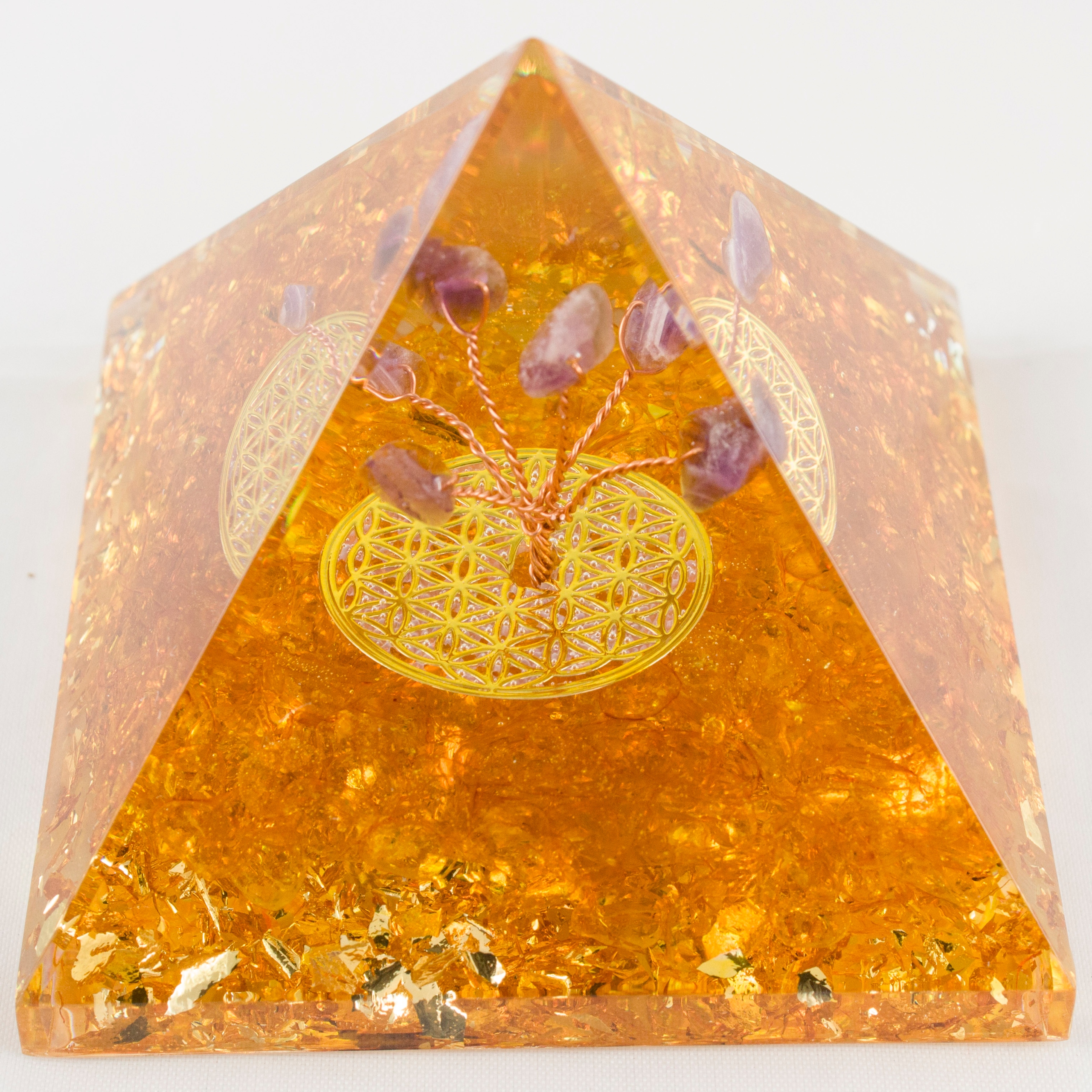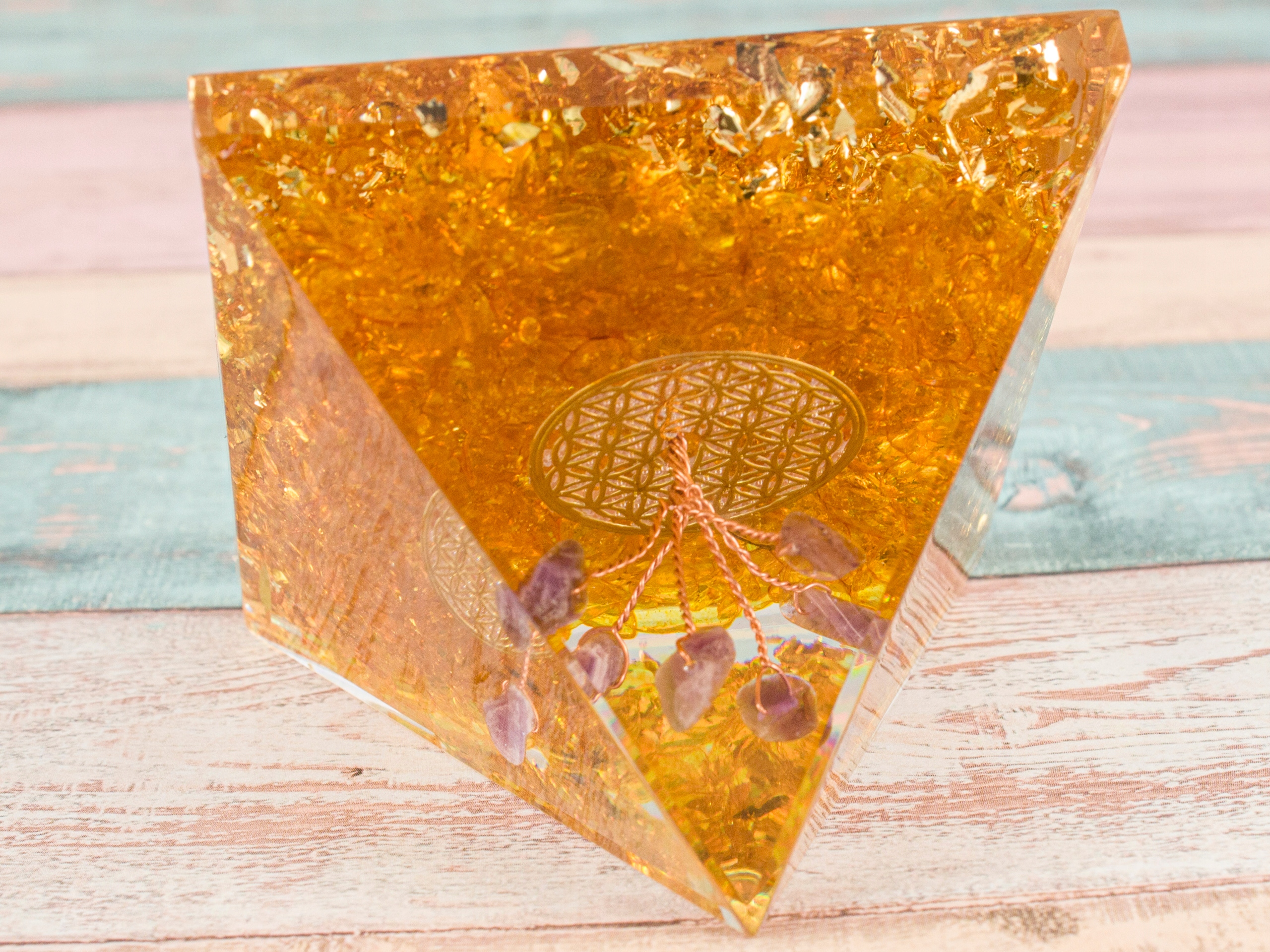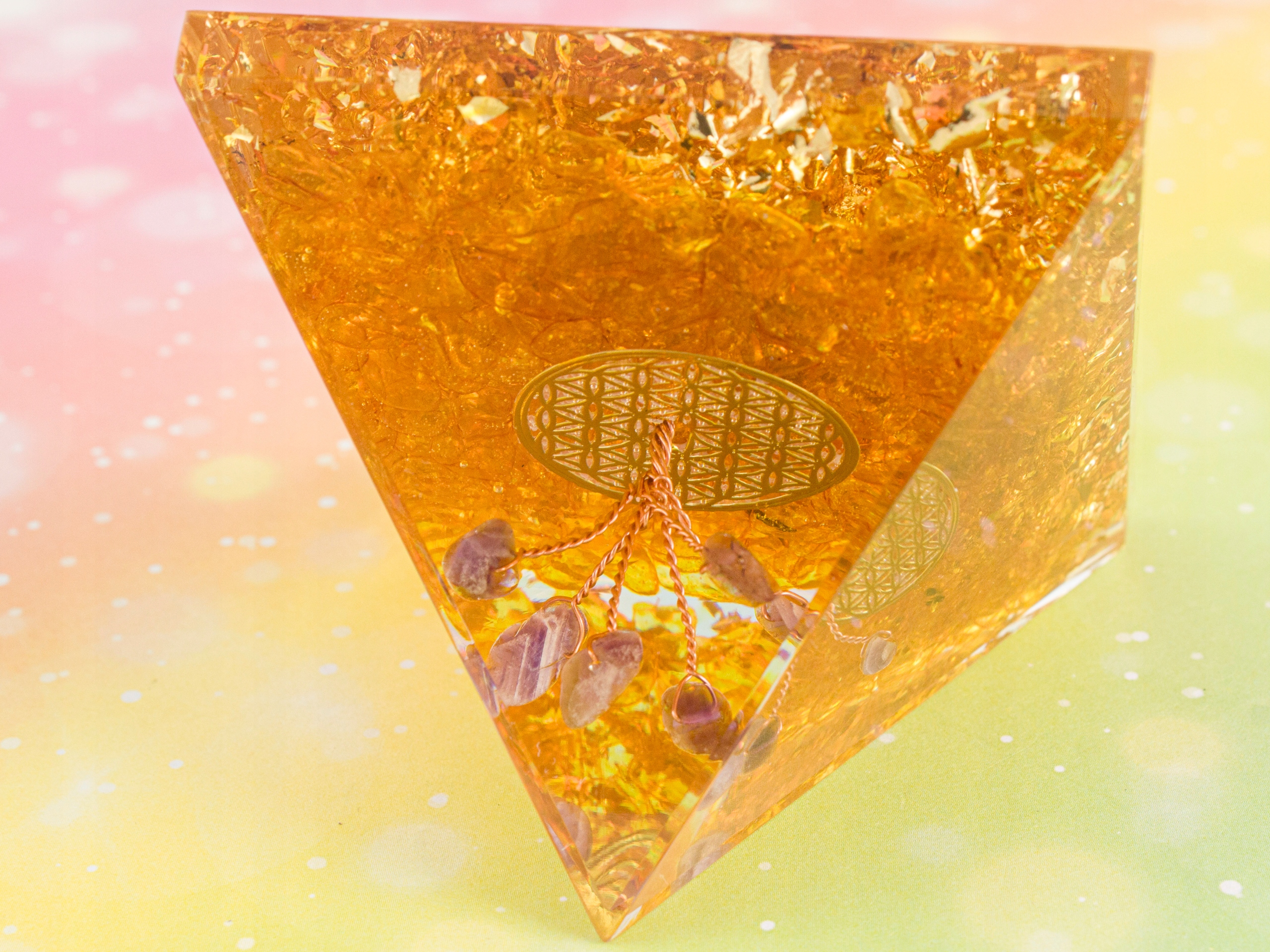 Оргонитовая пирамида с цитрином и аметистом с золотой фольгой и символом Цветка Жизни. Символ духовного роста, изобилия и внутренней гармонии.