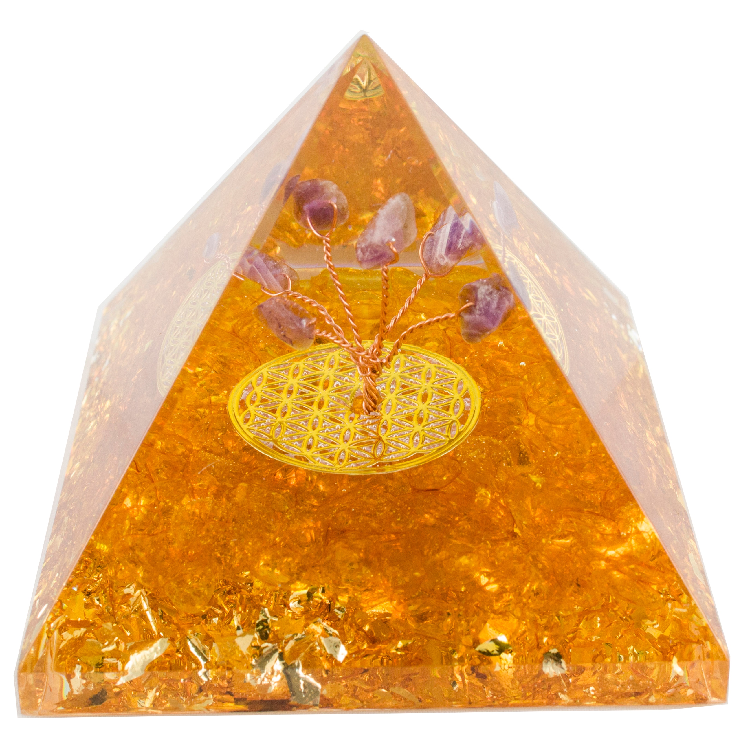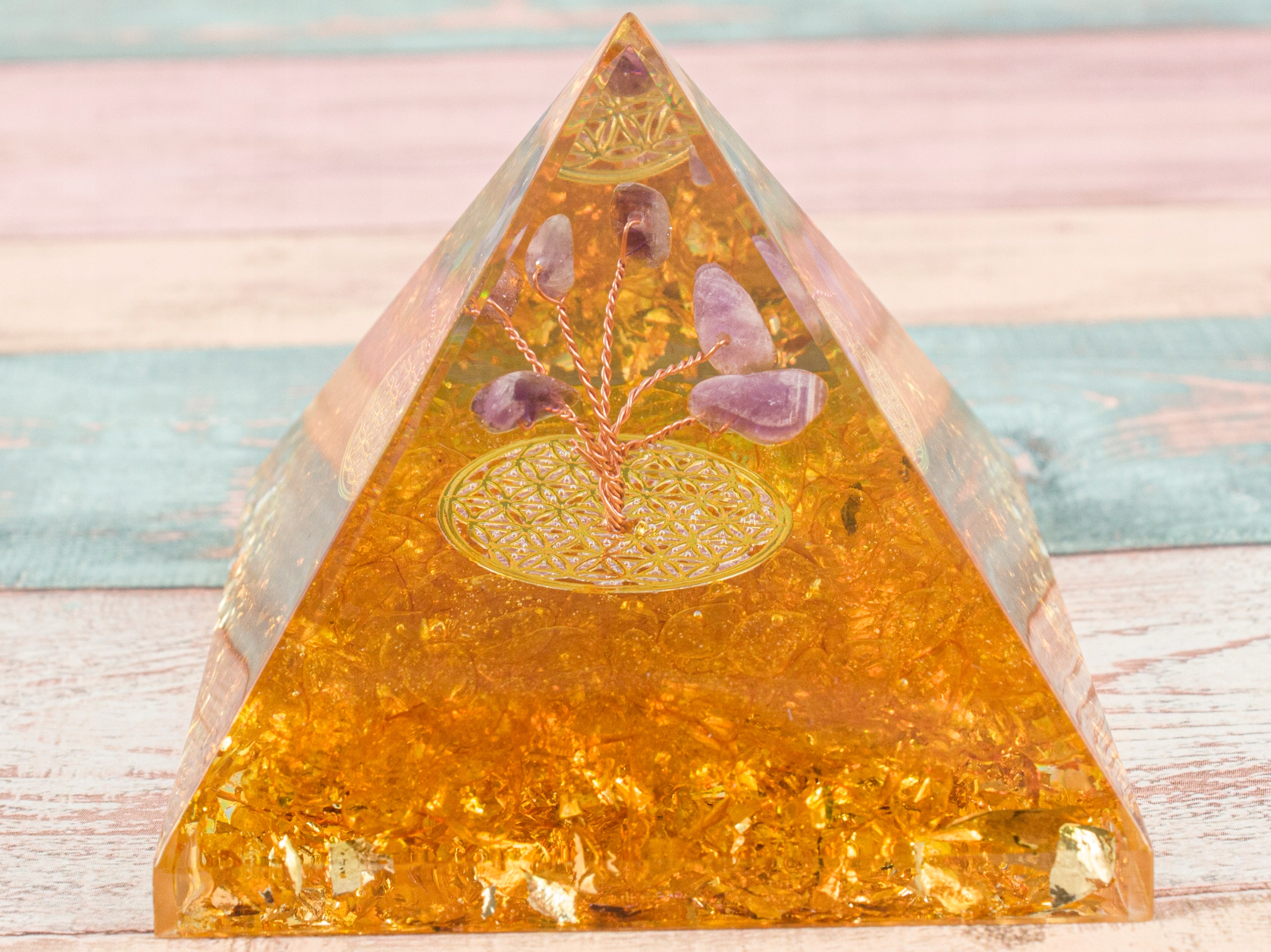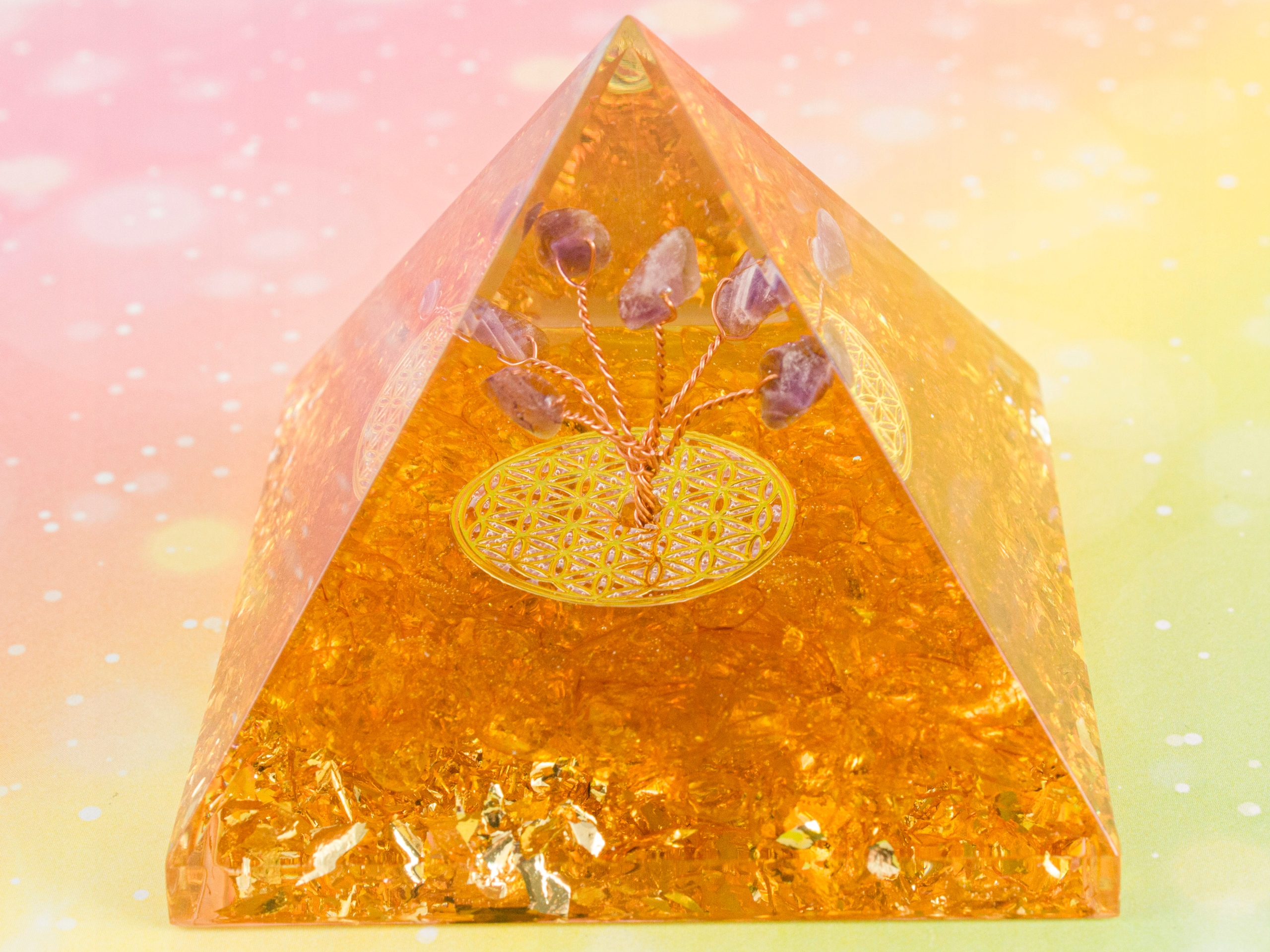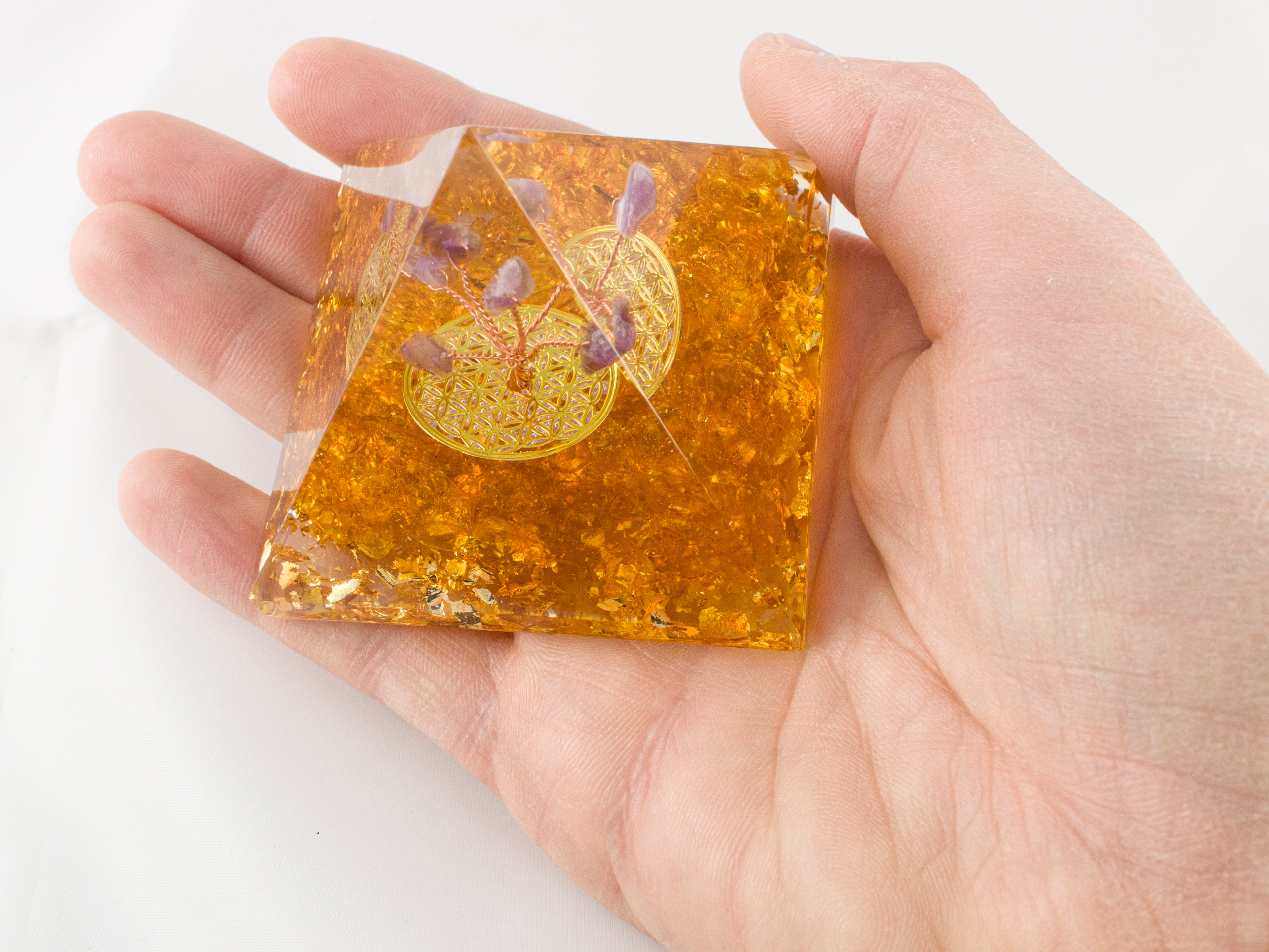 Оргонитовая пирамида с цитрином и аметистом с золотой фольгой и символом Цветка Жизни. Символ духовного роста, изобилия и внутренней гармонии.