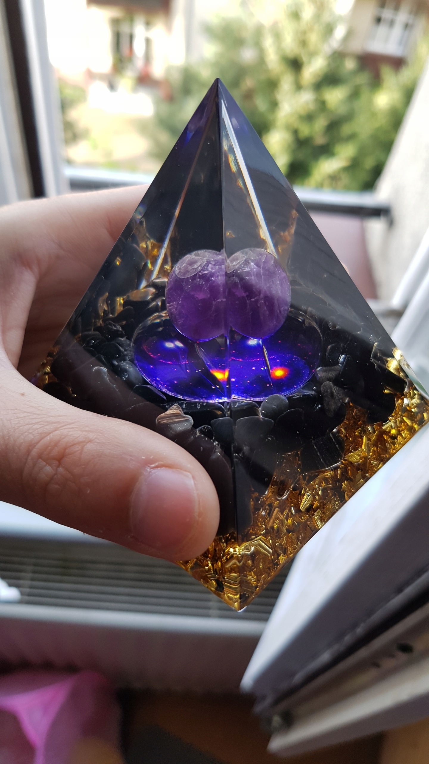 Большая оргонитовая пирамида с дымчатым кварцем (морионом), обсидианом и аметистом в виде шара над символом Инь Ян в стиле ночное звездное небо – это уникальное украшение, которое изготовлено из смолы и высококачественных материалов, а содержащиеся в нем кристаллы и камни были тщательно отобраны, чтобы дополнять друг друга.