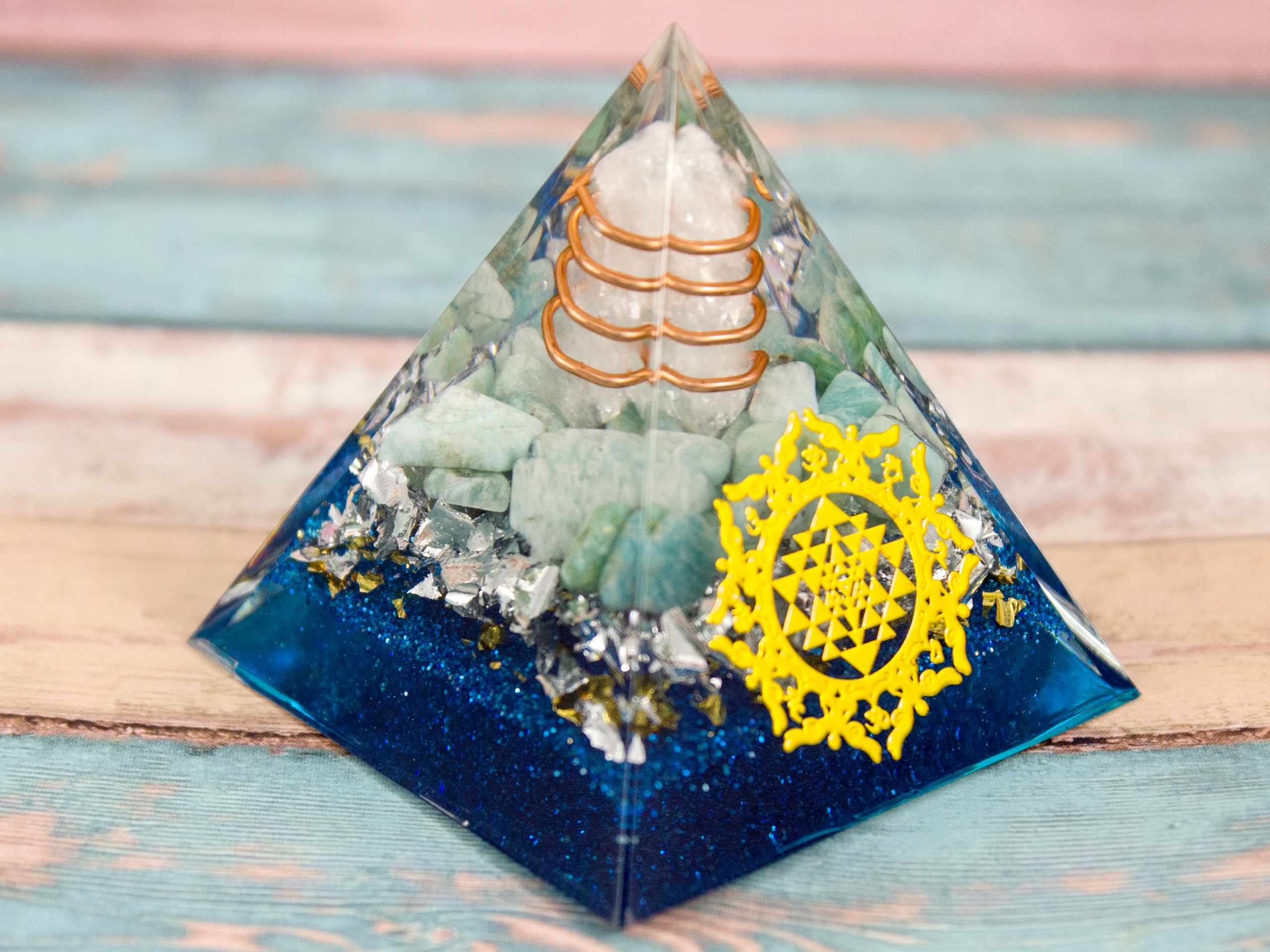 Красивая пирамида из амазонита и кристалла с символом Шри Янтры с комплексным положительным энергетическим эффектом.
