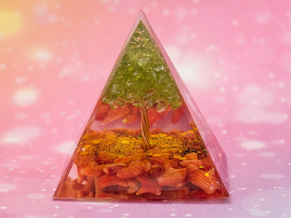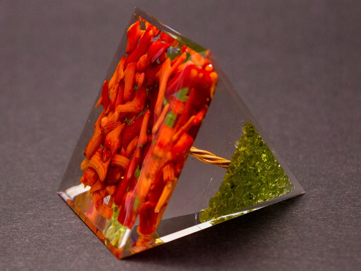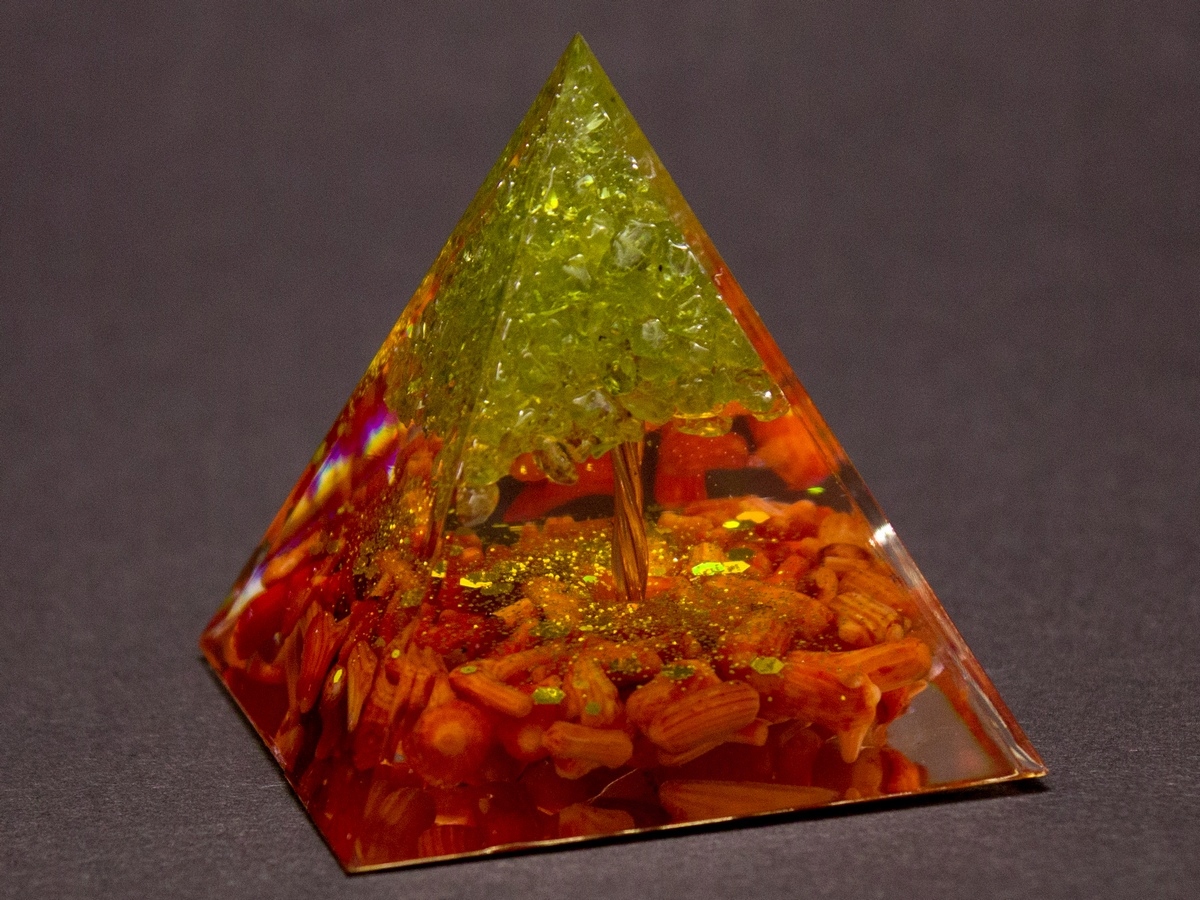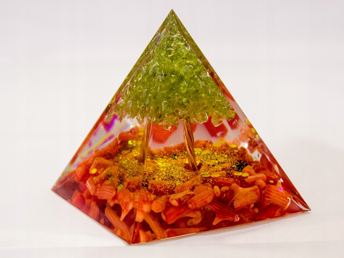Красивая пирамида с зеленым Оливином, счастливым и дружелюбным минералом, образующим форму Дерева, вместе с чистой медью и Красным Кораллом - поможет в достижении успеха, защита от травм. h2>Оргонит Пирамида - излучатель с красивым, насыщенно красным Кораллом и Оливином - энергетическое воздействие на все 7 чакр человека, а также красивый внешний вид и чудесные цвета минералов.