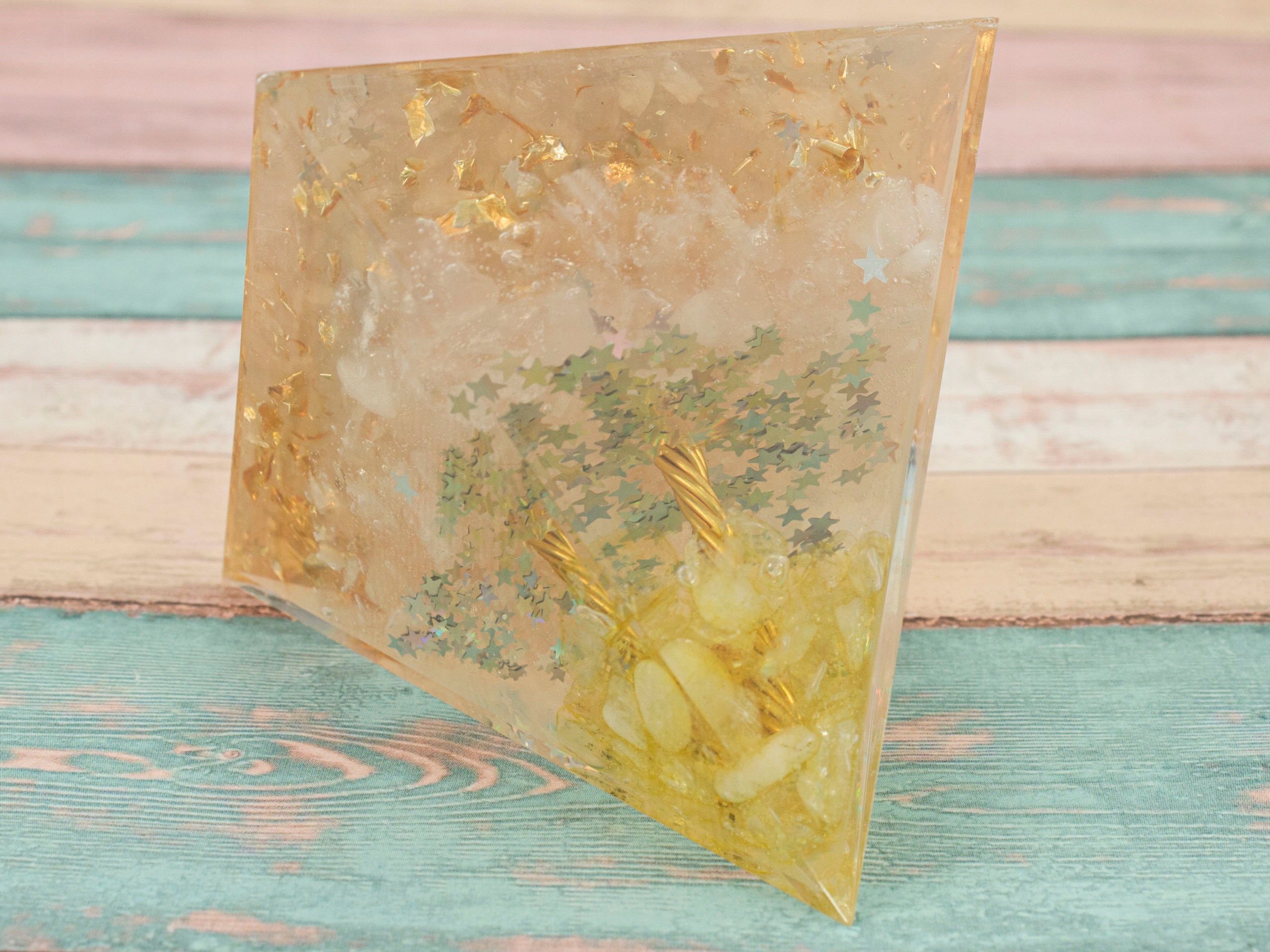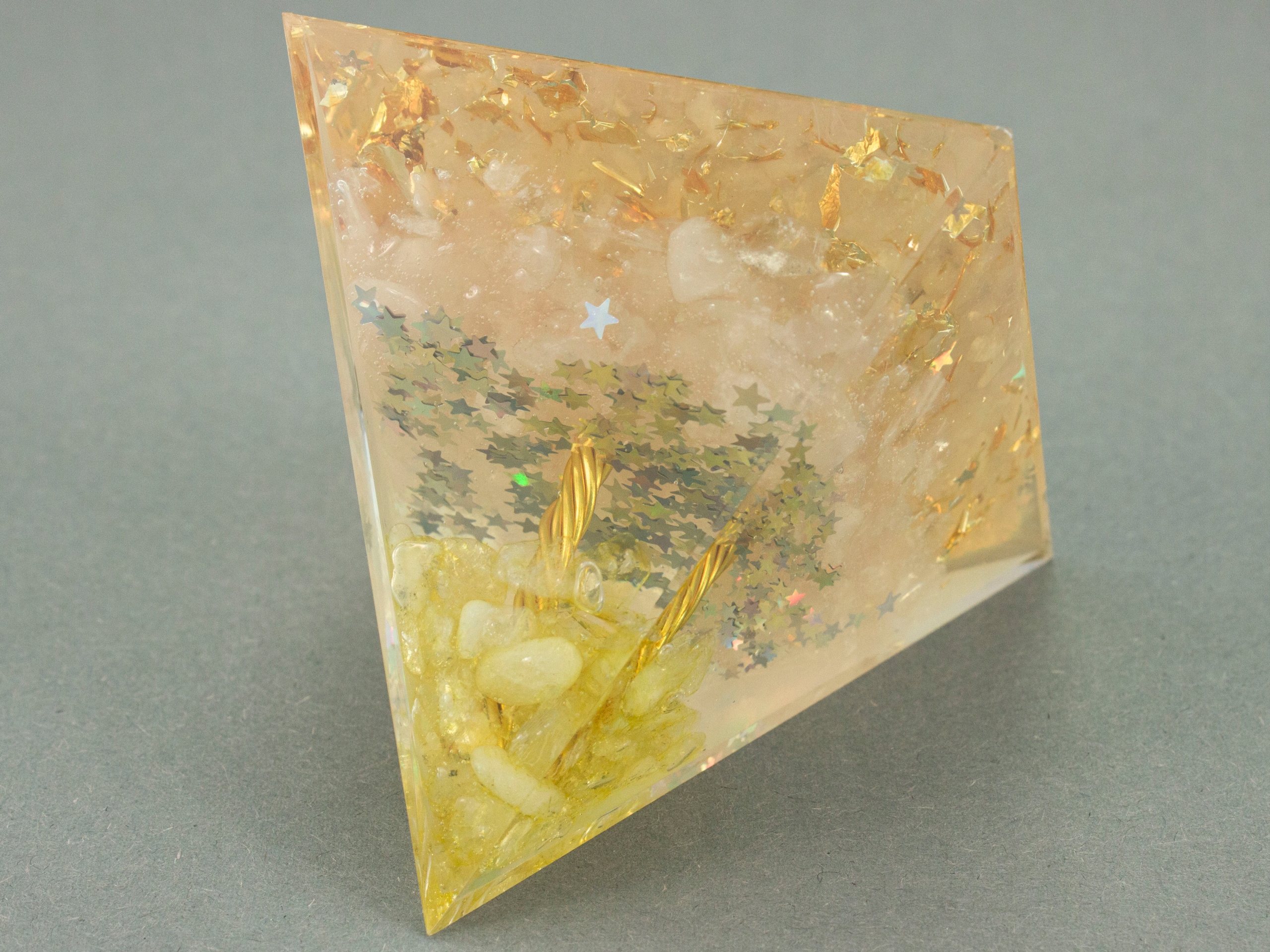 Оргонитовая пирамида с красивым внешним видом, изготовленная из красиво сочетающихся кристаллов, камней, медной и золотой фольги. Серебряные звезды внутри, прямо под лимонным деревом, переливаясь на свету, придают пирамиде характер и красоту.