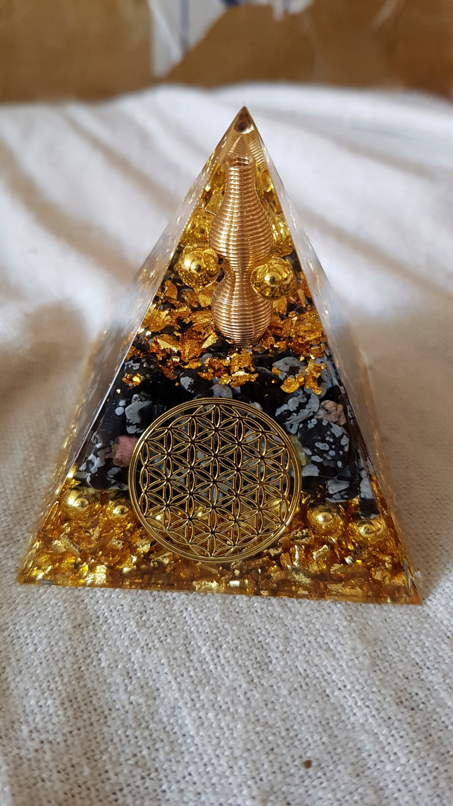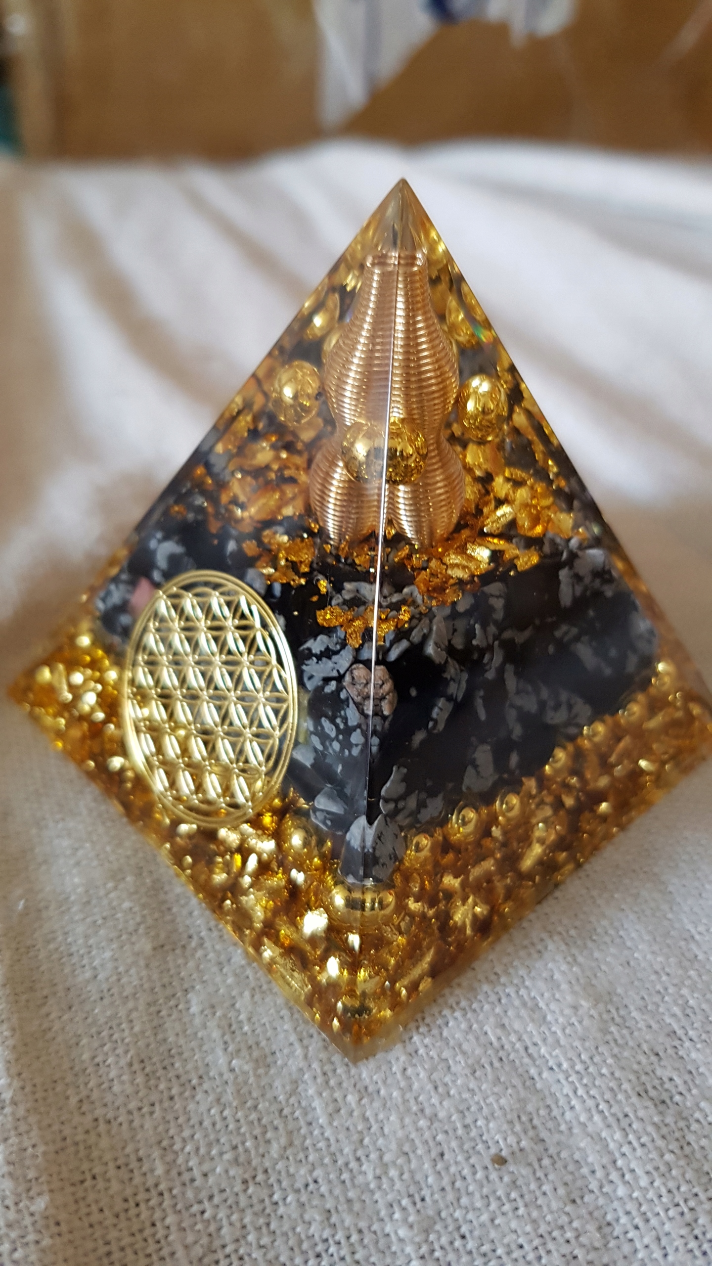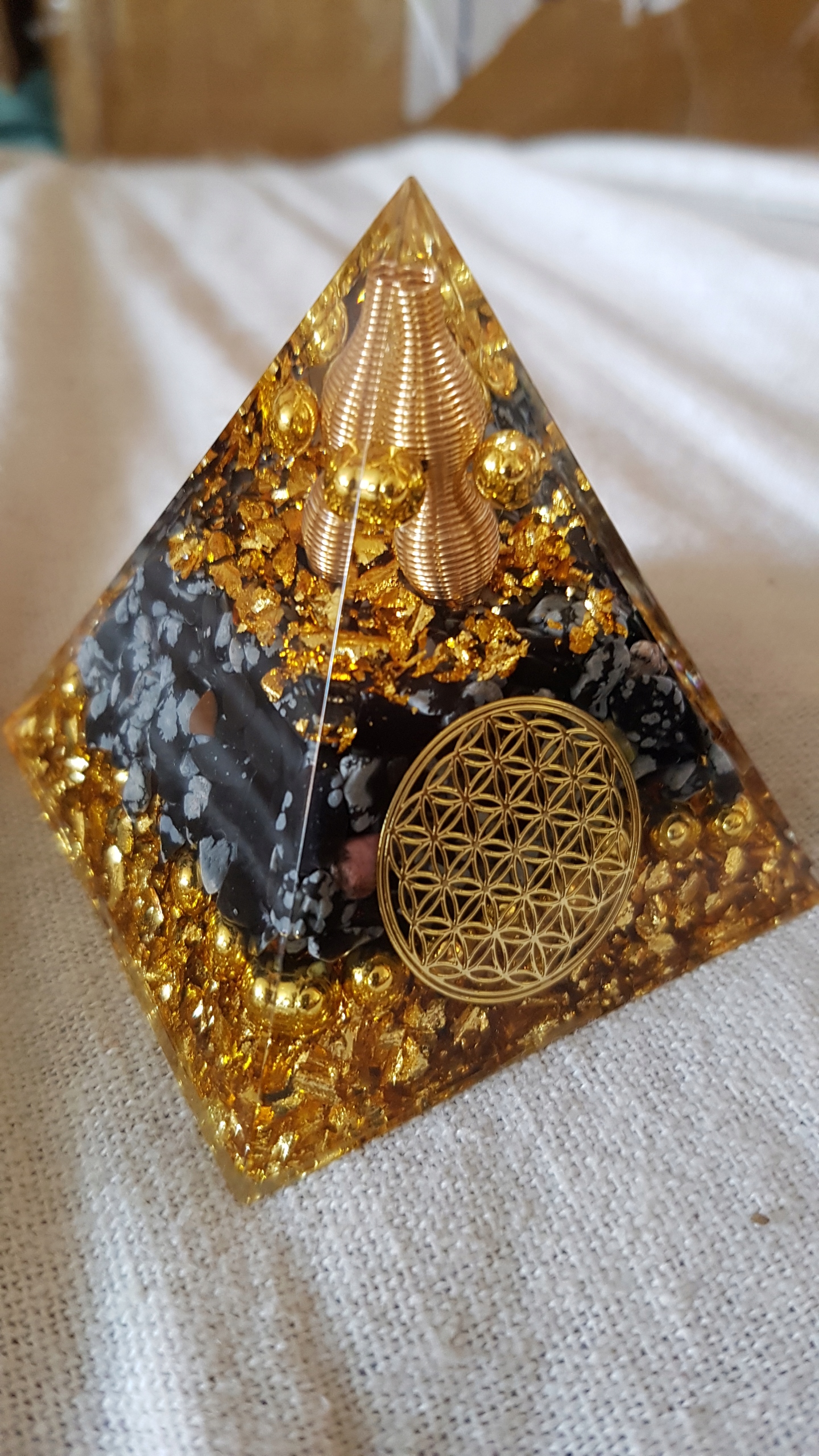 Откройте для себя волшебство оргонитовой пирамиды со снежным обсидианом, Цветком Жизни, золотой фольгой, жемчугом из сплава меди и золота, которые прекрасно сочетаются по цвету с целым!